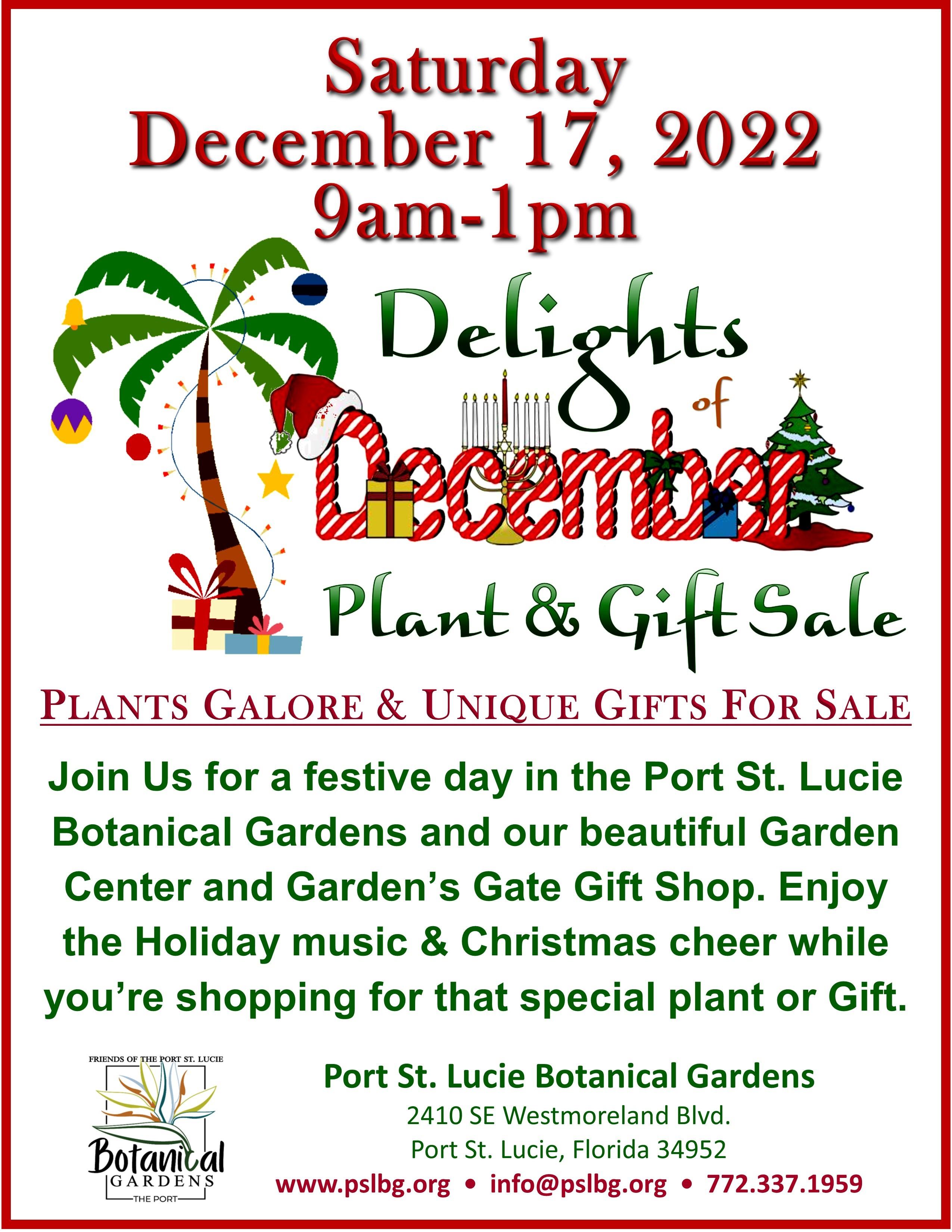 Are You Looking for Fun and Educational Children’s Activities? The Gardens is the Perfect learning environment!!! Our NEW Discovery Back Packs are available to the public inside the Pavilion, free of charge, for parents and kids to take an exciting adventure and learning experience through the Gardens. Adults may sign-out backpacks Wednesday thru Saturday 10am - 4pm and Sunday 12noon - 4pm, with a Valid State ID, for use within our Gardens. Scheduled Lessons are available to public and Private schools. Inquire at our front desk or email education@pslbg.org. Thank You. 5 Please Enjoy 20% OFF All Purchases in the Garden’s Gate Gift Shop from 11/1 - 12/31 And Join Us for Artists in the Lobby on Select Friday and Saturday Evenings from 5-9 pm During the Holiday Lights at The Gardens Event.