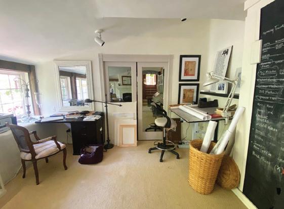Jennifer’s studio, where she takes care of paperwork, completes sketches, stretches canvases, and keeps track of progress on the chalkboard.