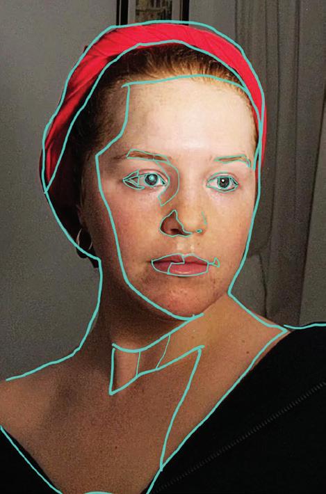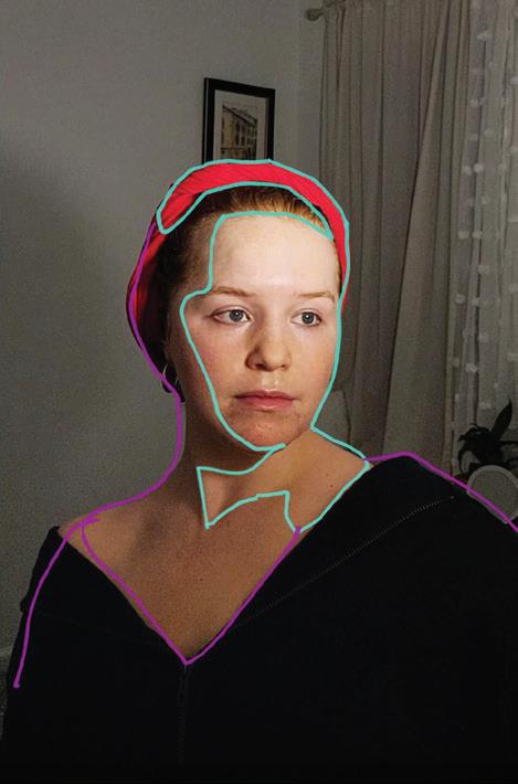 In the photos below, I’ve outlined some shapes that stand out to me. You can see larger shapes to small shapes. I’m constantly looking back and forth between my reference and art to see if the shapes match, and how they all relate to each other. (The white of the eye is a larger shape than the iris etc.)