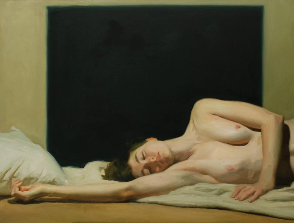I chose to use oil paint as my medium for this piece as I felt it would aid in the attempt to create movement along the figure’s form, as well as establish body in the texture of the brushstrokes. In this painting a nude figure is lying on the ground with an ominous black square behind her shoulders and a seemingly unaware expression on her face to her surroundings and current predicament. The gesture of each arm acts as a continuation of the black square merging with the angular contours inviting the viewer to traverse its void. The subject matter is placed at eye level with the viewer to create a bridge to enter the scene. When the viewer is standing in front of this painting, the black square also behaves similarly to a mirror due to the reflectiveness, causing the viewer to become a part of the image as a faint reflection in the glossy paint.