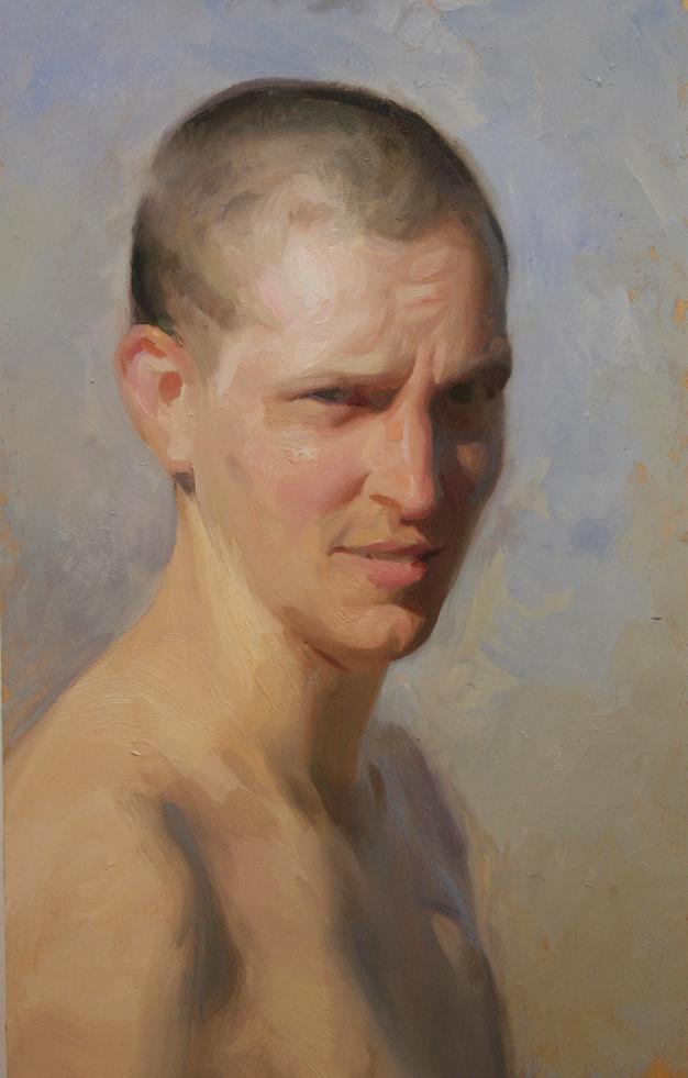 My painting Rob came after a trip to the sea with some friends. I like to represent the personality of people I know, and I felt that the open setting of the beach allowed me to record them bare and uninhibited. Rob is a real character, often seeming on the edge of sincerity and facetiousness, and I was drawn to the challenge of representing this subtlety. I was inspired by the characterful portraits of Sorolla, and Velasquez’ Los Borrachos. I became interested in portraiture during my time in secondary school. I began to attend life drawing sessions that were offered after class. From this I developed an interest in the old masters, and I realized the lack of education there is in painting naturalistically from life.