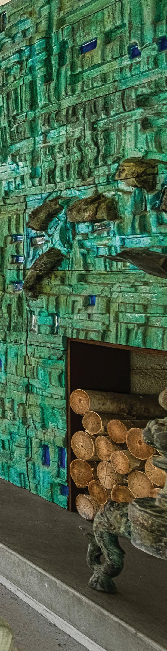 A sunken tub with an unobstructed view of a private outdoor spa. An expansive, covered outdoor pavilion anchored by a fireplace finished with tiles by celebrated ceramic sculptor Stan Bitters. The Abernathy residence celebrates the value of connection with a series of intimate spaces, many of which seamlessly blend the outdoor environment with carefully curated indoor ones — often separated by frameless, floor-to-ceiling glass.