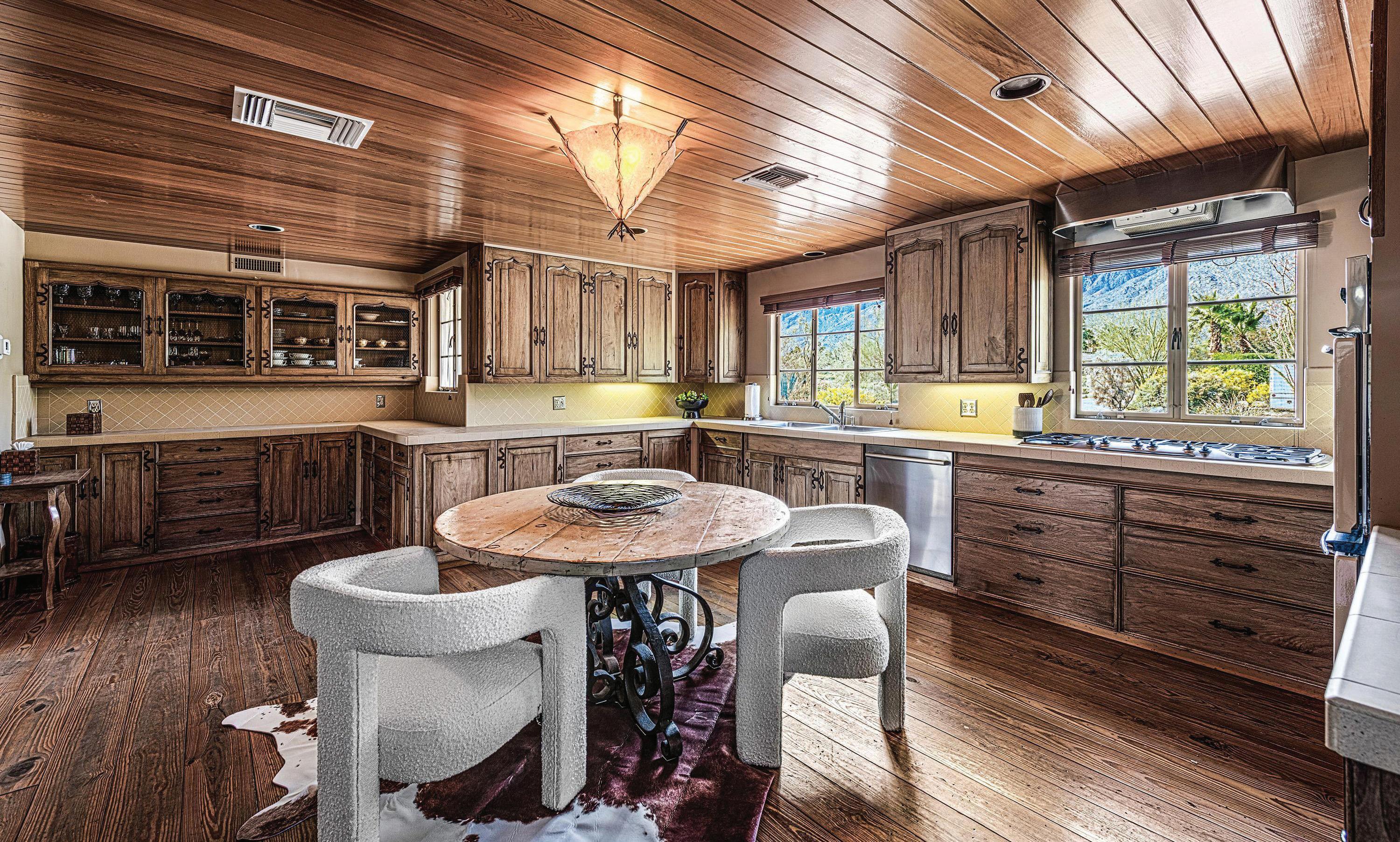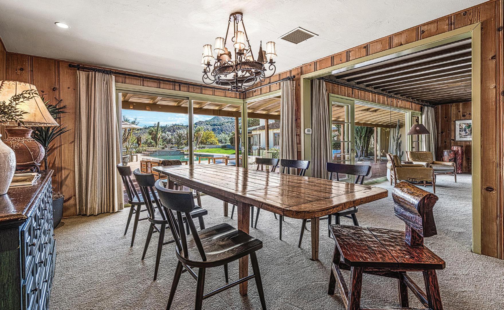 The U-shaped footprint of the home, anchored by a rectangular pool and spa, oozes rustic charm with its exposed beam ceilings and wood-paneled walls. Its sale includes pre-approved renovation plans for modern additions that align with preservation standards, from an additional three-car garage to a new pool pavilion.