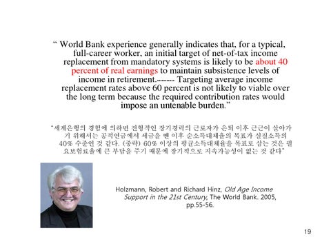 “ World Bank experience generally indicates that, for a typical, full-career worker, an initial target of net-of-tax income replacement from mandatory systems is likely to be about 40 percent of real earnings to maintain subsistence levels of income in retirement.••••••••••• Targeting average income replacement rates above 60 percent is not likely to viable over the long term because the required contribution rates would impose an untenable burden.” “세계은행의 경험에 의하면 전형적인 장기경력의 근로자가 은퇴 이후 근근이 살아가 기 위해서는 공적연금에서 세금을 뗀 이후 순소득대체율의 목표가 실질소득의 40% 수준인 것 같다. (중략) 60% 이상의 평균소득대체율을 목표로 삼는 것은 필 요보험료율에 큰 부담을 주기 때문에 장기적으로 지속가능성이 없는 것 같다”