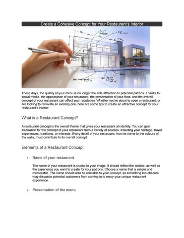 These days, the quality of your menu is no longer the sole attraction to potential patrons. Thanks to social media, the appearance of your restaurant, the presentation of your food, and the overall concept of your restaurant can affect your reputation. Whether you’re about to open a restaurant, or are looking to renovate an existing one, here are some tips to create an attractive concept for your restaurant’s interior.
