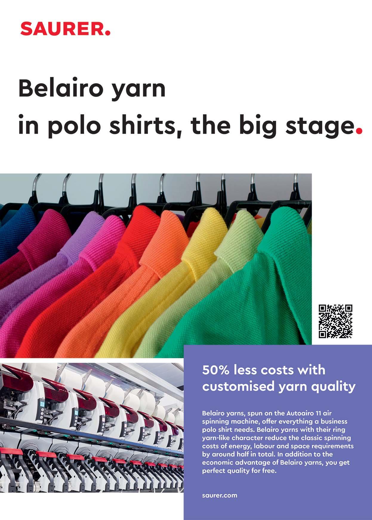 Yarns for fabrics with high washing stability, low pilling, and durability: Belairo yarns from the new Autoairo 11 air spinning machine are ideal for polo shirts, towel piles, or fine knit fabrics.