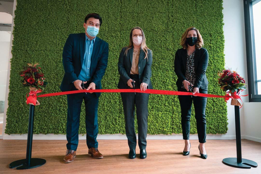 Christoph Buser, Director of the Economic Chamber Baselland (Wirtschaftskammer Baselland), Heike van de Kerkhof, Chief Executive Officer of Archroma, and Silke Wischeropp, General Counsel of Archroma, at the ribbon cutting ceremony of the new Archroma HQ in Pratteln.
