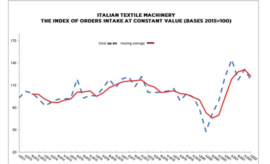 The orders index for textile machinery for the first quarter of 2022, processed by ACIMIT, the Association of Italian Textile Machinery Manufacturers, shows a slight decrease (4%) compared to the same period from January to March 2021. In absolute value, the index stood at 117 points (basis: 2015 = 100).