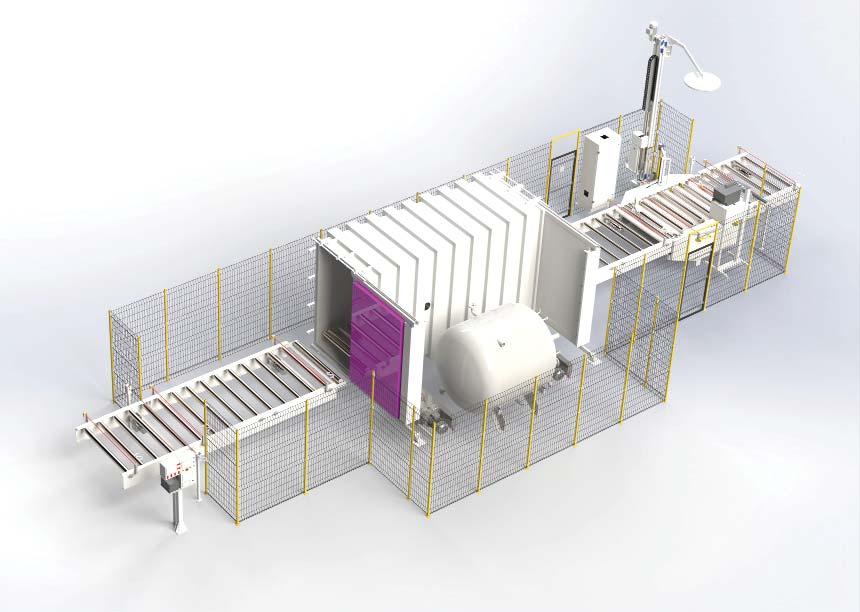 The new XO AUTOMATION system consists of roller conveyor systems for loading and unloading two-door XO Select conditioning machines. Additional pallet wrapping machine with a turntable, weighting station, label printer, safety fence and security system can complete the system. The XO Select controller and automation system can handle and store individual customer-specific material and packing programmes.