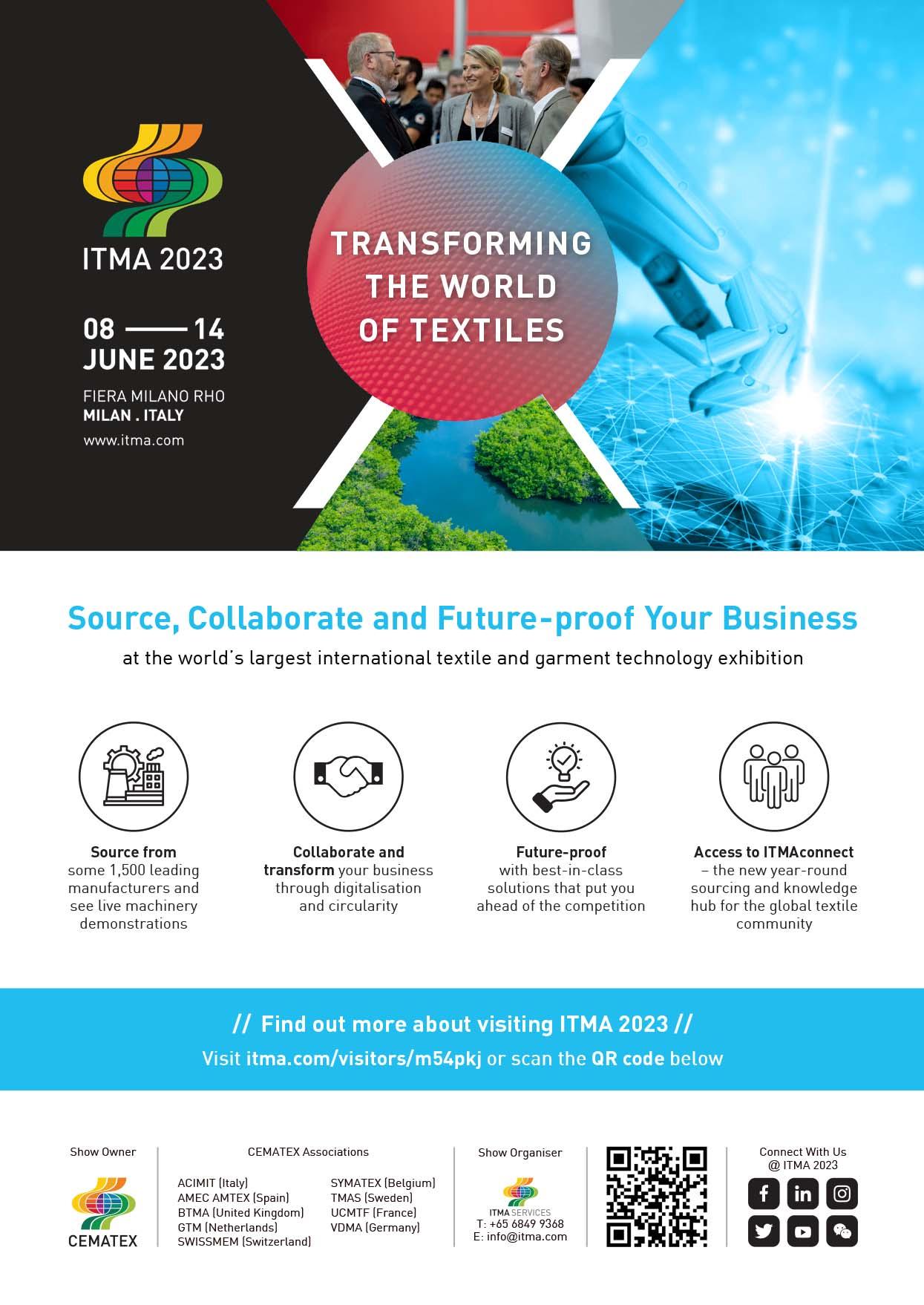 Accotex......................................................................31 Archroma...................................................................FC AVM Chemicals.....................................................6 & 64 Benninger....................................................................11 Biancalani SpA.............................................................19 Chhipasons.................................................................64 CCI USA.......................................................................1 Demsan........................................................................9 IGATEX Pakistan 2022...............................................55 ICADEX Pakistan 2022...............................................57 ITMA 2023...............................................................IBC iTextiles......................................................................33 Jet Logistics................................................................64 MS Printing................................................................21 Picanol.........................................................................3 Rieter..........................................................................23 Rastgar.............................................................. 53 & 64 Rebus International Inc. ..............................................49 Santex Rimar Group....................................................15 SPGPrints...................................................................BC SSM AG......................................................................17 Suessen.......................................................................35 Suzhou Liansheng Chemistry.....................................IFC Textile Asia..................................................................63 Classified ADVERTISERS INDEX OCTOBER 2022