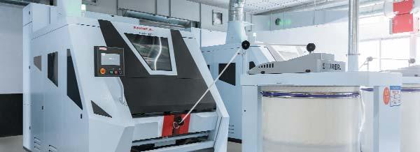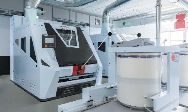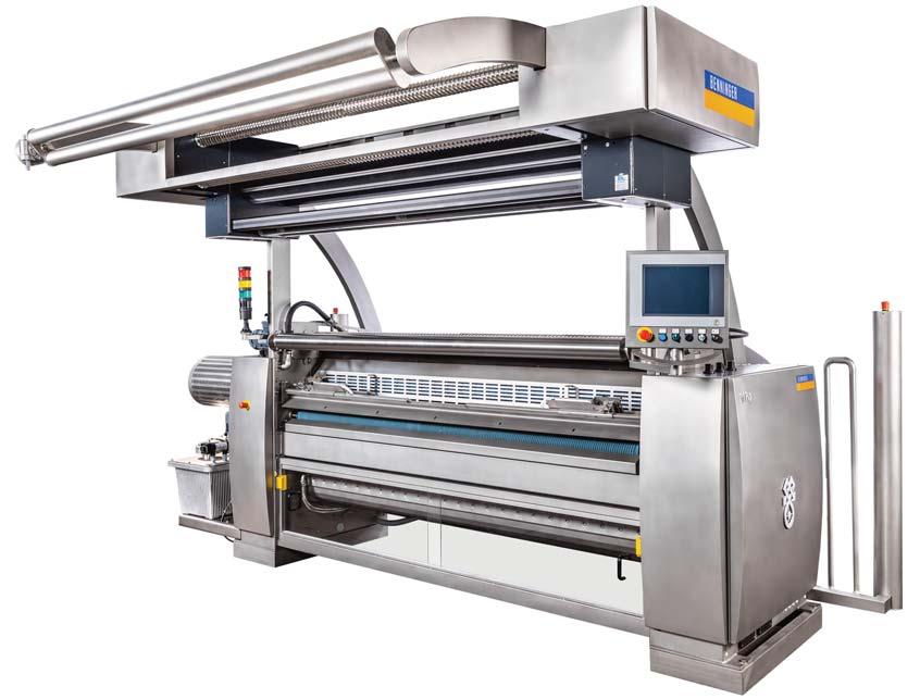 The new POWER-FRAME SFP-2 stenter frame generation is being presented, which is particularly attractive for finishing fabrics with a high cotton content. This machine can be used for drying and heat-setting processes, is easy to clean thanks to horizontally arranged lint screens, and features an intelligent splitflow air circulation system, a vertical circu-