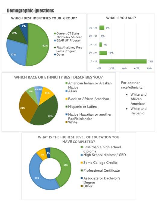 The survey reached 316 Meriden residents, with 9.17% responding by the end of the fall semester. Predominantly, respondents were current CT State students followed by students from the GEAR UP program. The age distribution showed 71% falling in the 16 to 19 range. In terms of race or ethnicity, 42% identified as Hispanic/Latino, and 31% as White. Regarding education, 46% completed high school or equivalent, while 42% reported having less than a high school diploma. For academic interests and goals, 47% of individuals are currently taking two classes, while 27% are enrolled in three classes. As for aspirations, 42% aim to obtain a bachelor’s degree, and 27% aspire to pursue a graduate degree. The popular fields of interest among this group include business and hospitality, with