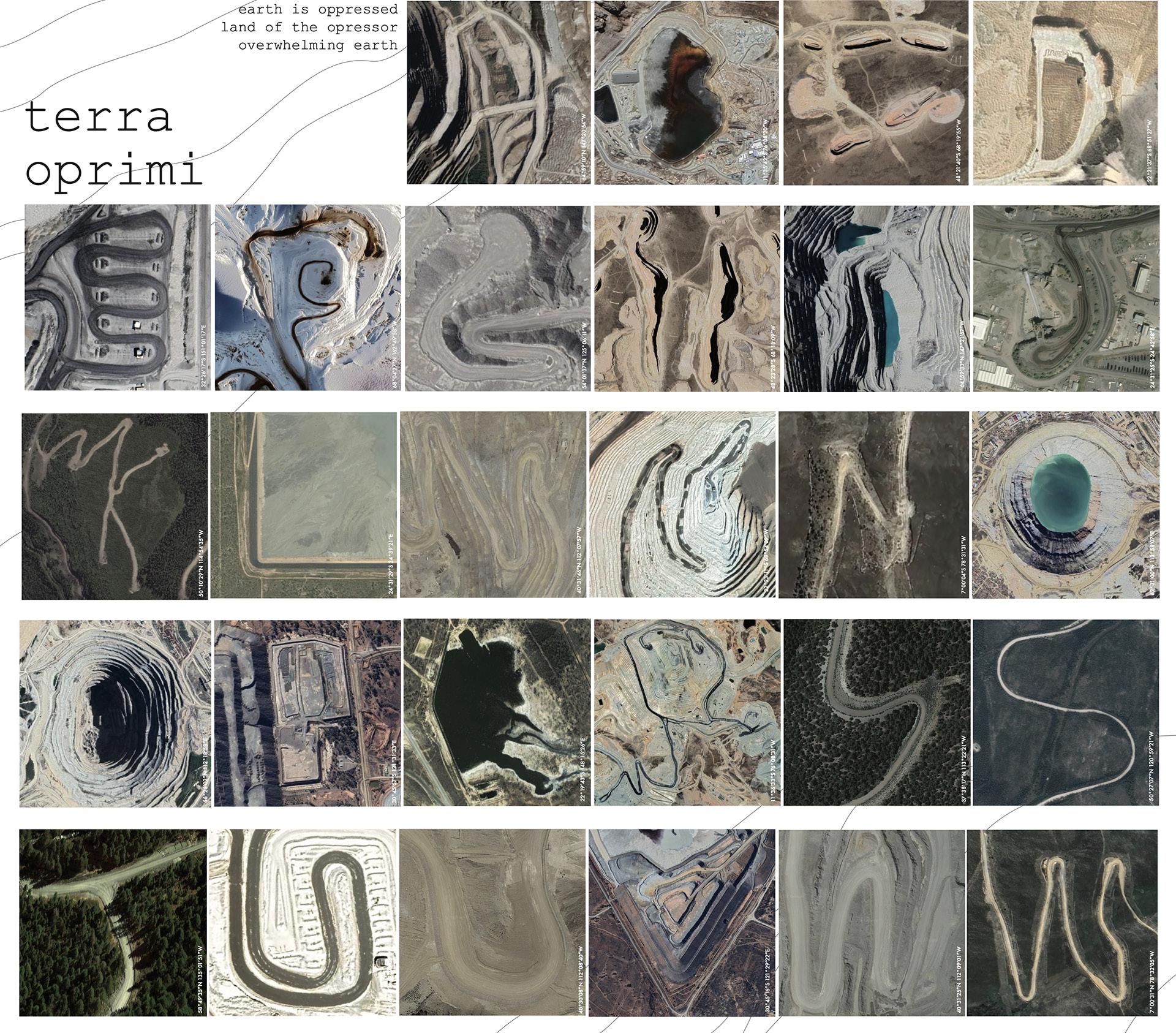 When I frst discovered mines, from an aerial standpoint, it looked like a beautiful national park, carved by rare erosion that I’d never seen before. Zooming in, the unfortunate reality began to settle in and I realised it was a manufactured landscape. Terra oprimi’s purpose is to educate. To intrigue the general public with an unsettling colour palette, beautiful imagery, and a strong message that does not shame but rather informs. Compositionally, Terra Oprimi challenged me to fnd a hierarchy that highlights the message frst, easing the reader with topographical lines, and eventually sharing a resource, in coordinate form, that is readily accessible for any viewer who wants to take action.