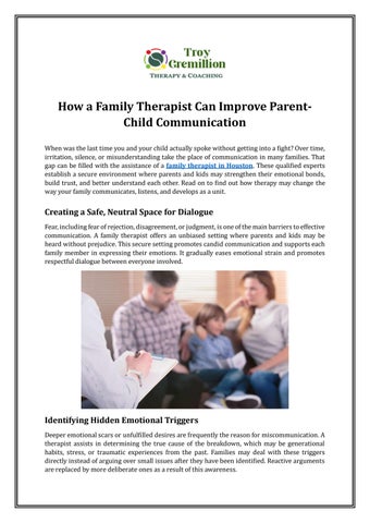 Whendomesticissuesbecometoomuchtohandle,onemayquestionwhetherassistanceiseven possible.Afamilytherapistcanhelpwiththat.Thesecertifiedexpertshavereceivedtrainingin assisting families in resolving disputes, improving communication, overcoming emotional challenges,andnavigatingsignificantlifechanges.A family therapist in Houston mayhelpyour familyfindabetterunderstandingandstrongerbond,whethertheissueisparent-teenconflictor moreseriouslong-termissues.Let'sexploretheirprecisefunctionsandtheimpacttheymake.