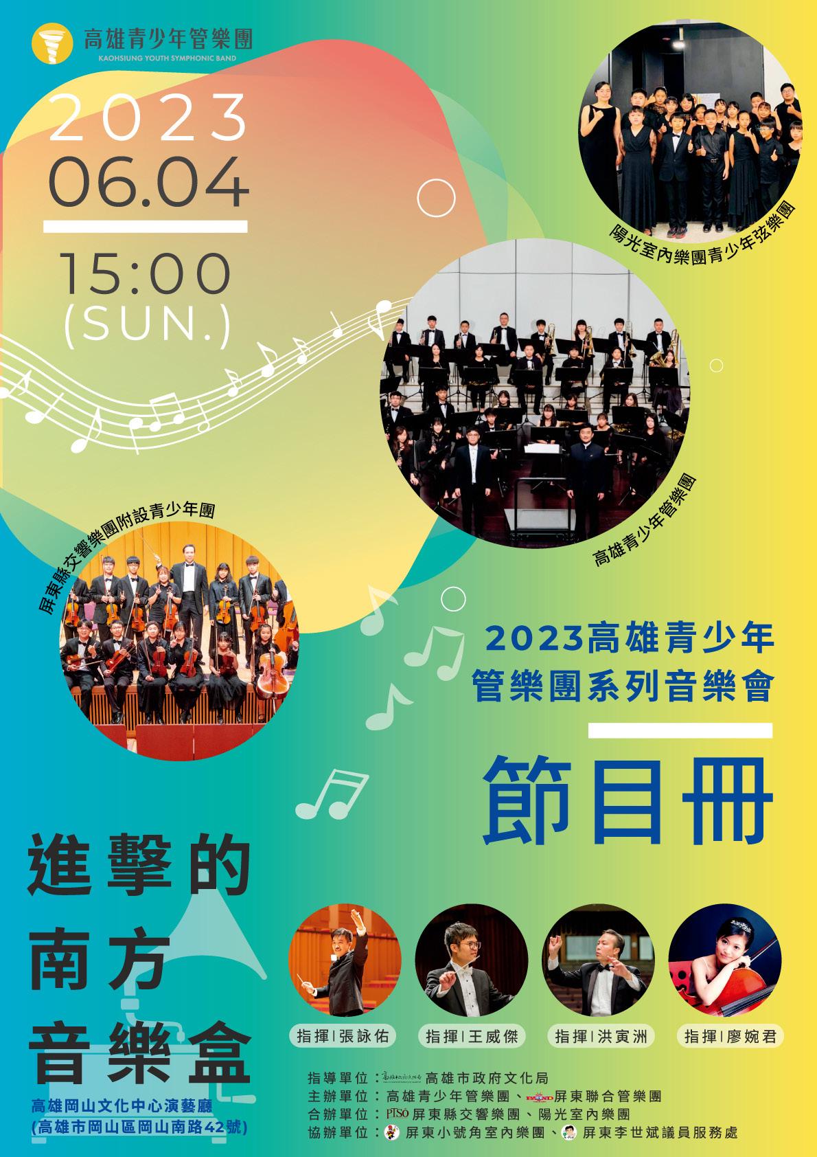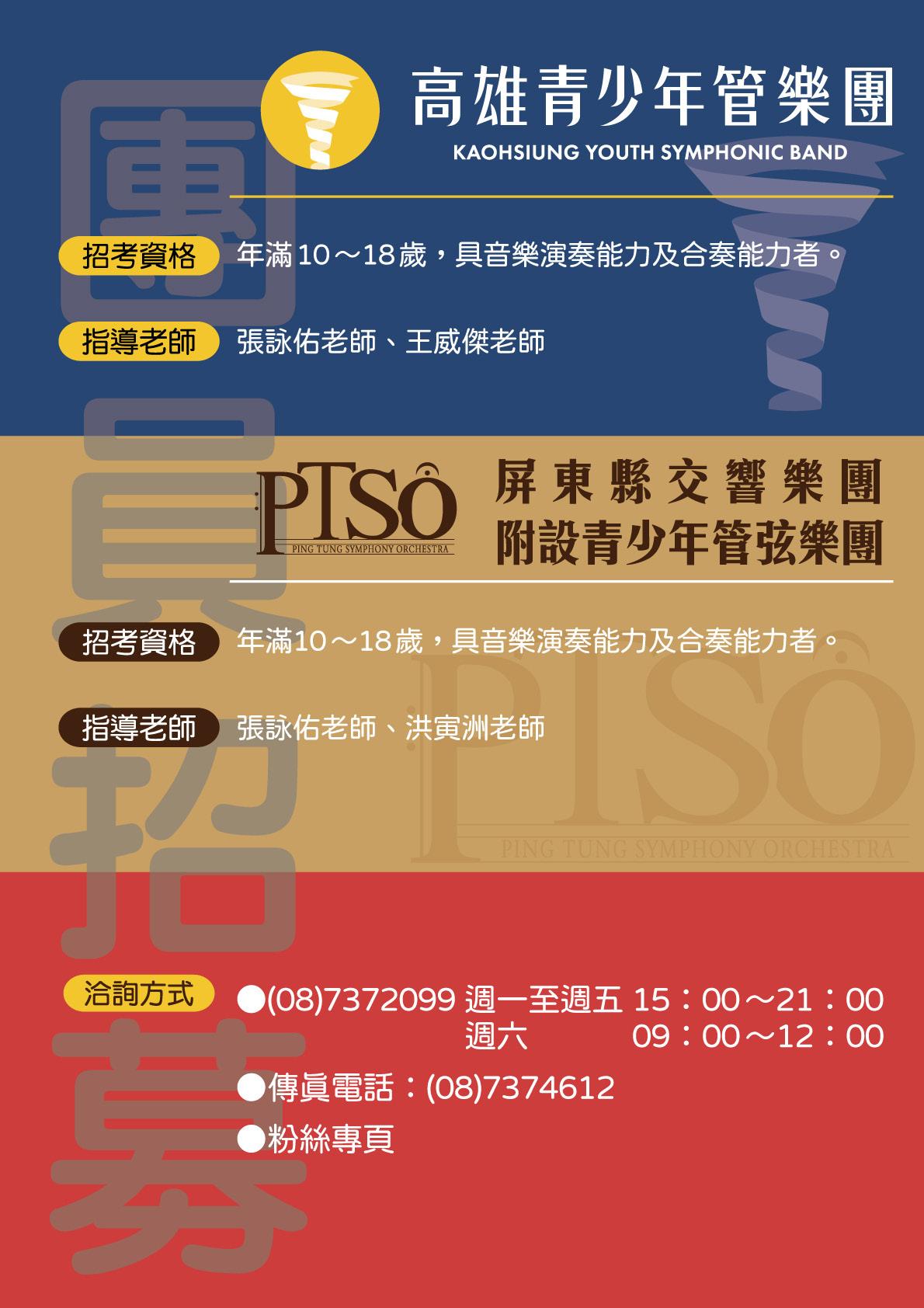 高雄青少年管樂團,之前為屏東聯合管樂團附設青少年管樂團成立於 107年9月,於108年9月正式命名為高雄青少年管樂團,團員為國小四年 級至高中三年級熱愛管樂、打擊的優秀青少年,每周以精實的分部課程及合 奏課程豐富孩子們的管樂學習。由知名的指揮張詠佑老師及王威傑老師共同 指導,除了安排國內演出之外,未來將以國際交流演出拓展學員世界觀,歡 迎南部地區熱愛管樂、打擊的優秀學員加入高雄青少年管樂團!