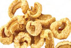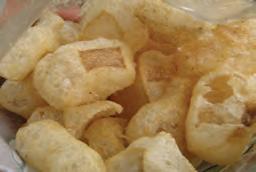 Deep-fried dried pork skin, often rehydrated first, then fried until puffy. Used in soups, braised dishes, or served as a snack.