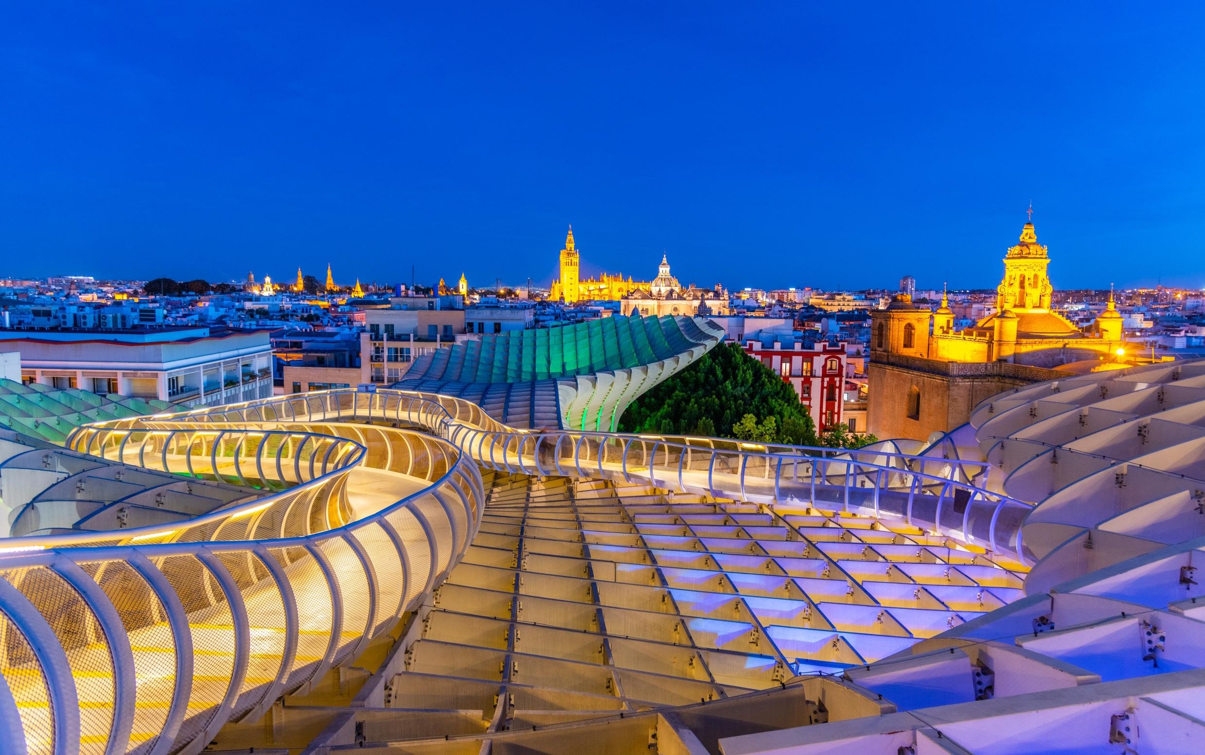 Op een grote paddenstoel Ondanks dat ik me uitstekend vermaak op het terras, lonkt het immense Metropol Parasol - ook wel bekend als de paddenstoelen van Sevilla - naar me. Een kunstwerk waar je u tegen zegt. Met een afmeting van grofweg 150 bij 70 meter en op een hoogte van 26 meter overdekt Metropol Parasol het plein Plaza de la Encarnación, in de wijk Centro. Dat het indrukwekkend is, is één ding, maar de architect heeft boven op de parasols een bijzonder wandelpad aangelegd dat uitzicht biedt over de hele stad. Overdag is het mooi, maar bij zonsondergang is het prachtig.