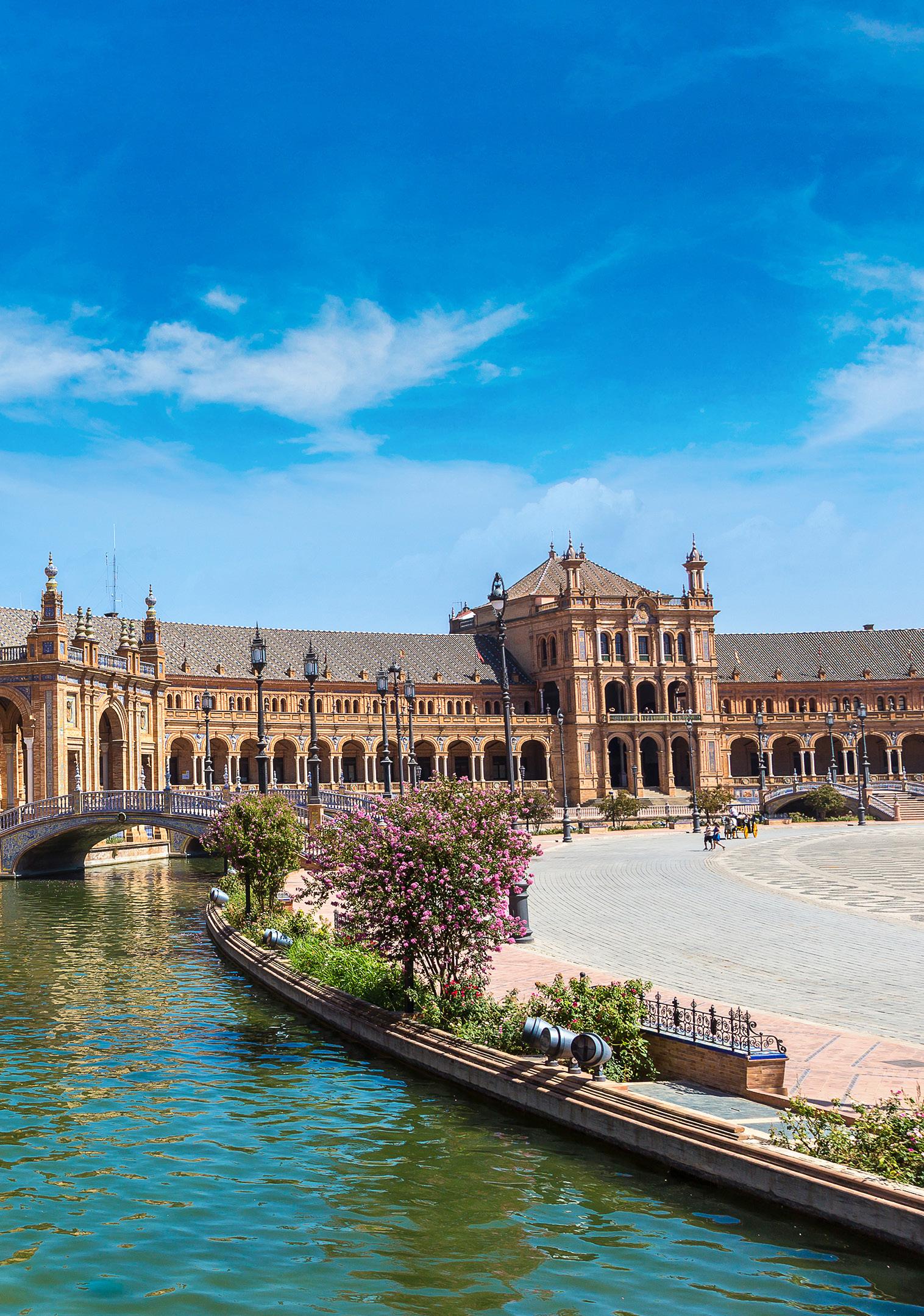 en kleding, schoenen en souvenirs die ik niet per se nodig had - terug te komen. Al mijmerend over het fijne Spaanse leven bereik ik Plaza de Espana, dat in park Maria Luisa ligt. Imposant is het eerste woord dat in me opkomt, gevolgd door adembenemend mooi. Bijzonder zijn de 52 bankjes bekleed met Andalusische tegeltjes die alle Spaanse provincies vertegenwoordigen. Maar ook de grote fontein midden op het plein en de gracht met de vele bruggetjes zijn een lust voor het oog. Het is dat ik er de tijd niet voor heb, anders had ik een bootje gehuurd om in de grachten te varen.