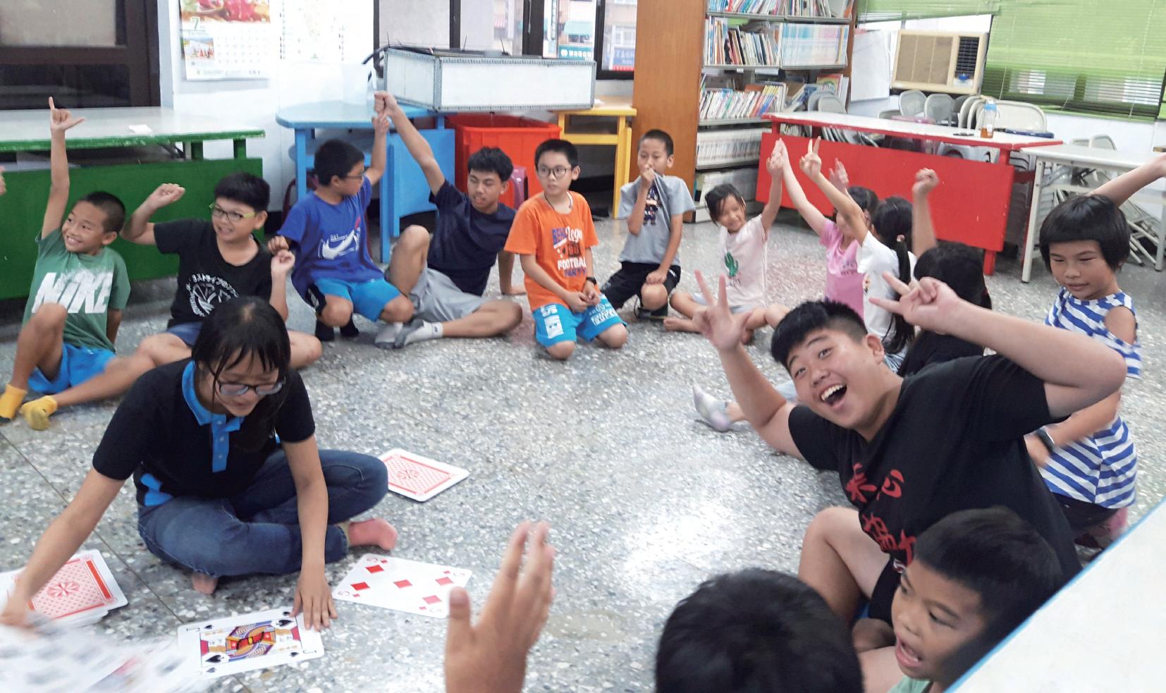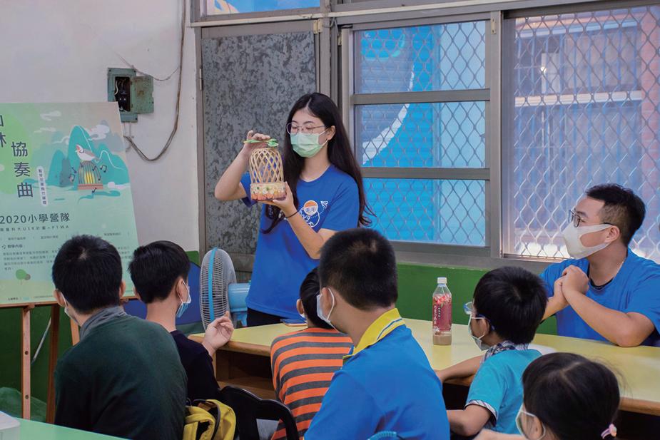 的同學整裝待發前往各地,這也許是這群大 學生第一次教導孩子,臉上略顯緊張與不安。 但是當他們在看到孩子們天真無邪的臉龐後, 緊張與不安瞬間煙消雲散,自造教育社的學 生教孩子們編織竹籠,孩子們細心的編織他 們自己的竹籠燈,身旁的哥哥姊姊一步步指 導他們。編完竹籠接下來是孩子們最期待的 彩繪時間,每個孩子挑自己喜歡的圖案,並 為其上色,大家發揮創意將原本黯然無色的 圖像彩繪得五彩繽紛。為了讓平橫鳥可以正 確的感應按壓,孩子們還必須寫一些簡單的 程式,這一整套的課程都是自造教育社的學 生精心準備的。在營隊結束的最後一天結業 式,每位孩子手中都捧著自己做的竹籠燈, 竹籠燈裏頭的LED燈像極了孩子們閃爍希望 的眼睛。