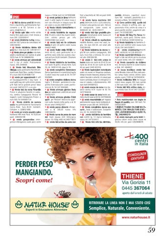 cambio shimano, copertoni nuovi. Euro 100 trattabili, possibilità di visionarla a Malo. Tel 0445607132 • @ Cerco antiche bici, quelle del nonno , rimaste in soffitta, vero appassionato ritira; anche da corsa e a pezzi purchè vecchie; pagamenti adeguati. Tel.3335823851 • @ Vendo AB King Pro Panca Addominali, usata poco. Ottimo stato. Euro 35 Telefono 320/9142045 hp • @ Vendo bicicletta da bambina 36 anni con rotelline semi-nuova euro 25.00. Cell 3401535817. • @ vendo snowboard+attacchi (soft) €250,00. tel 329-8022531 • @ Vendo caschi bici bimbo/a omologati a 5€ cad ottimi per la sicurezza dei vostri bimbi. Info 347-4646627 • @ Vendo scarpette da ciclismo mis. 36 marca Gaerne di colore bianco a 20€. 347-4646627 • @ causa inutilizzo vendo bici corsa Beraldo telaio all /forc.carb.cambio camp tripla corona ottimo stato adatta a pers 170/5 tal 3470404034. • Vendo bellissima Mtb lee lougan colore rosso, pagata 450 euro svendo a 250 euro tratt. cell. 338 1807834 • Vendo bici Mtb ottimo stato, misura media euro 35 tel 340 1232397