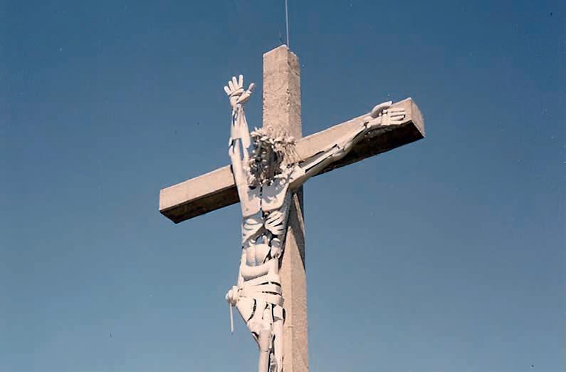 grandezza della croce: un Cristo che non sparisse nel cemento, ma che lo vincesse. Un Cristo della resurrezione e non della morte. Ho pensato che l’ultima cosa che un escursionista affaticato volesse vedere arrivato alla cima del monte fosse un Cristo vinto dalla morte e dalla fatica: serviva un’opera carica di speranza, forza, energia”. Perché un Cristo con il braccio alzato? E perché proprio l’acciaio?