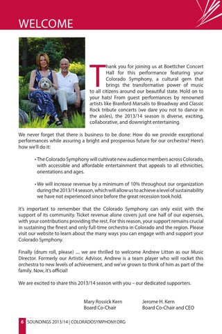 hank you for joining us at Boettcher Concert Hall for this performance featuring your Colorado Symphony, a cultural gem that brings the transformative power of music to all citizens around our beautiful state. Hold on to your hats! From guest performances by renowned artists like Branford Marsalis to Broadway and Classic Rock tribute concerts (we dare you not to dance in the aisles), the 2013/14 season is diverse, exciting, collaborative, and downright entertaining. We never forget that there is business to be done: How do we provide exceptional performances while assuring a bright and prosperous future for our orchestra? Here’s how we’ll do it: • The Colorado Symphony will cultivate new audience members across Colorado, with accessible and affordable entertainment that appeals to all ethnicities, orientations and ages. • We will increase revenue by a minimum of 10% throughout our organization during the 2013/14 season, which will allow us to achieve a level of sustainability we have not experienced since before the great recession took hold. It’s important to remember that the Colorado Symphony can only exist with the support of its community. Ticket revenue alone covers just one half of our expenses, with your contributions providing the rest. For this reason, your support remains crucial in sustaining the finest and only full-time orchestra in Colorado and the region. Please visit our website to learn about the many ways you can engage with and support your Colorado Symphony. Finally (drum roll, please) .... we are thrilled to welcome Andrew Litton as our Music Director. Formerly our Artistic Advisor, Andrew is a team player who will rocket this orchestra to new levels of achievement, and we’ve grown to think of him as part of the family. Now, it’s official! We are excited to share this 2013/14 season with you – our dedicated supporters.