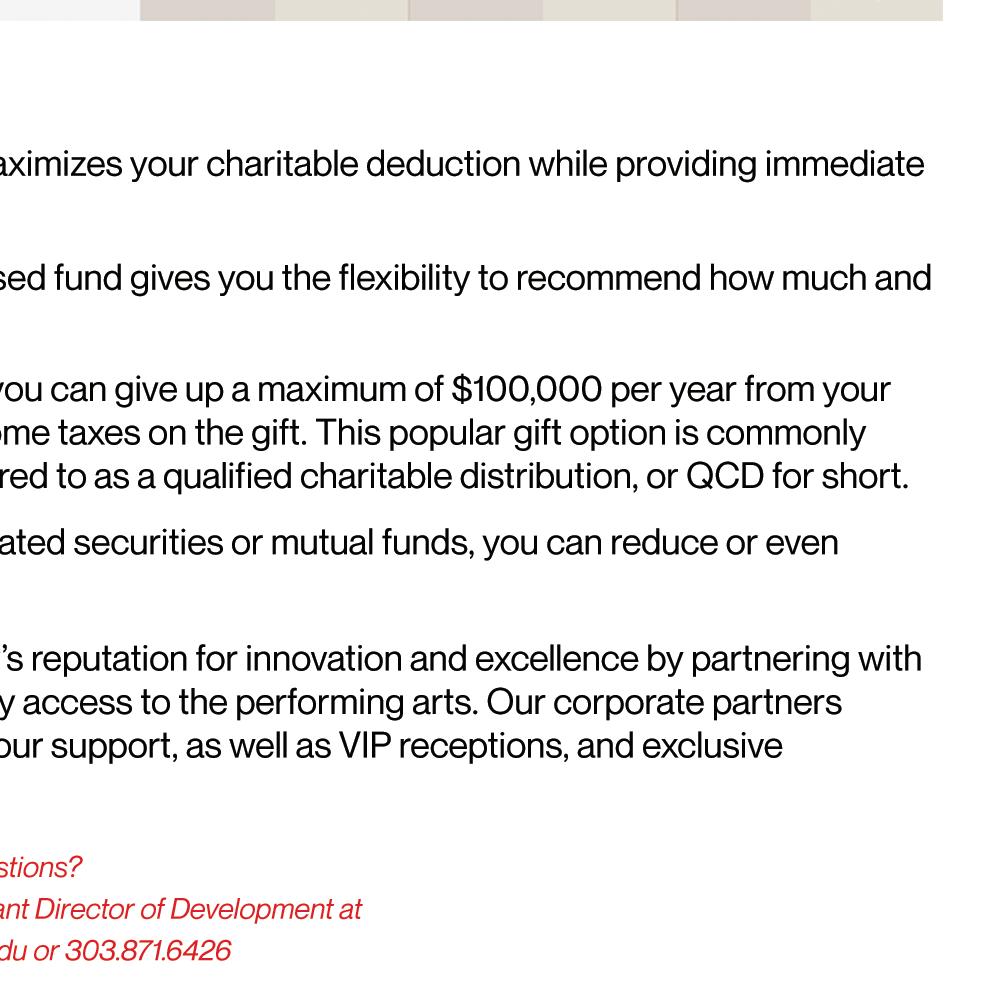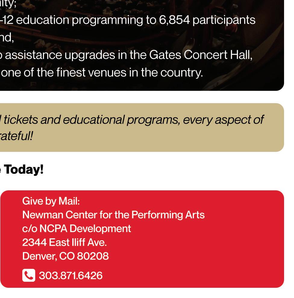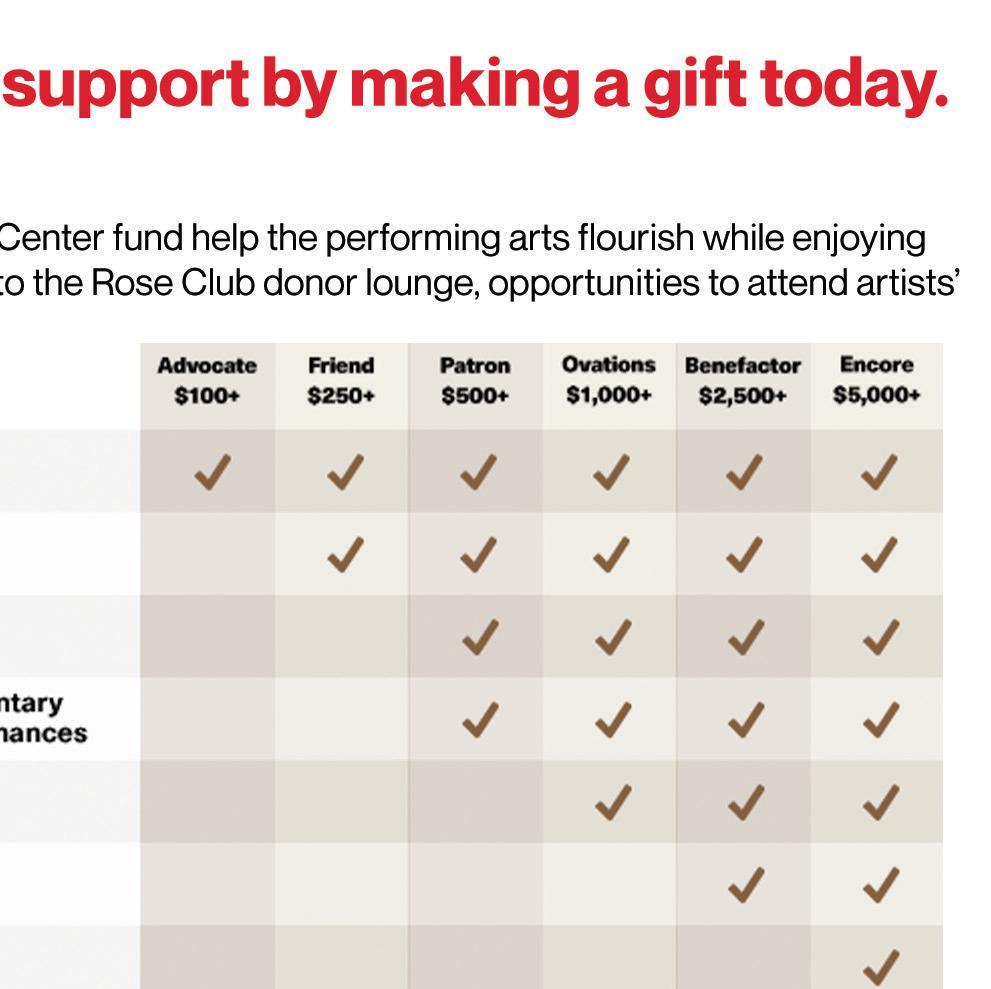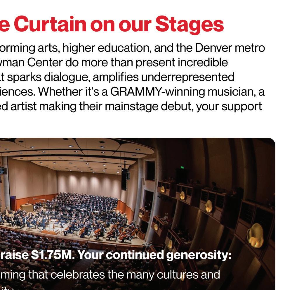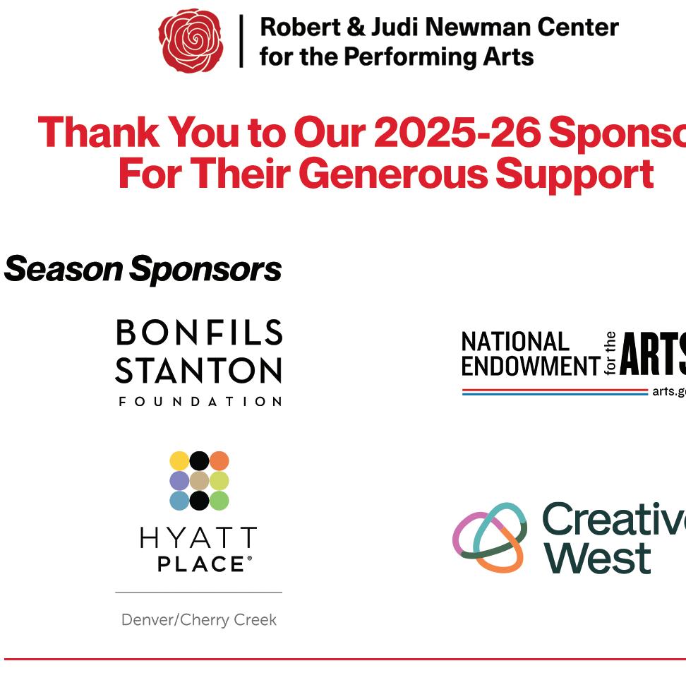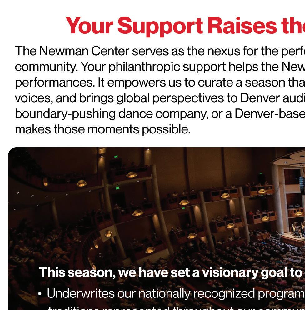 We invite you to deepen your connection with the Newman Center by joining our Giving Circles, a community of dedicated arts supporters who value the artistry you can only find here. Members enjoy exclusive courtesies, including access to the Rose Club with complimentary appetizers and refreshments before select performances, invitations to soundchecks and rehearsals, special artist conversations, and more. Your financial contribution supports our nationally recognized programming, strengthens educational initiatives for thousands of students and teachers, and fosters lasting partnerships throughout the Denver community. Learn more at newmancenterpresents.com/give.