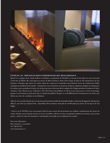 ÉTUDE DE CAS : TROUVER LES BONS ENTREPRENEURS AVEC RÉNO-ASSISTANCE Quand, il y a quelques mois, Nataly Grolleau, la fondatrice et propriétaire de NEOSPA a eu besoin de faire bâtir son centre de beauté et bien-être au DIX30, elle a fait appel aux services de Réno-Assistance. Dotée d’une banque de plus de 450 entrepreneurs de tous domaines, l’entreprise agit comme un courtier auprès des commerces et particuliers qui souhaitent trouver des entrepreneurs fiables répondant aux spécificités de leur projet. « Gratuitement, nous recherchons et contactons architectes, ingénieurs, designers et entrepreneurs de confiance qui conviendront le mieux à la situation que notre client nous décrit, explique Éric Périgny, président et fondateur de RénoAssistance. Nous effectuons une vérification à 360° afin d’éviter tout problème. Le client n’a pas à payer pour ce service de jumelage, puisque c’est le fournisseur choisi qui le paie en substitut de publicité. De plus, en cas de différend entre l’entrepreneur et le client, nous offrons un service de conciliation ou de médiation. » L’idée de créer une telle entreprise lui est venue alors que lui-même possédait des immeubles locatifs et avait besoin d’engager des entrepreneurs efficaces, une tâche pas toujours facile... Aujourd’hui, Réno-Assistance traite plus de 10 000 projets par année, de tout type et de tout budget. « Dans le cas de NEOSPA, nous avons proposé l’aide de notre avocate afin de permettre une meilleure compréhension des clauses du contrat. De plus, tout au long des travaux, un de nos conseillers a effectué un suivi en participant à plusieurs rencontres entre les deux parties », ajoute-t-il. Ainsi, les rénovations se sont déroulées à merveille avec le résultat que l’on connaît… Pour toute information : Réno-Assistance, c’est gratuit! 1877 RENO-360 www.renoassistance.ca