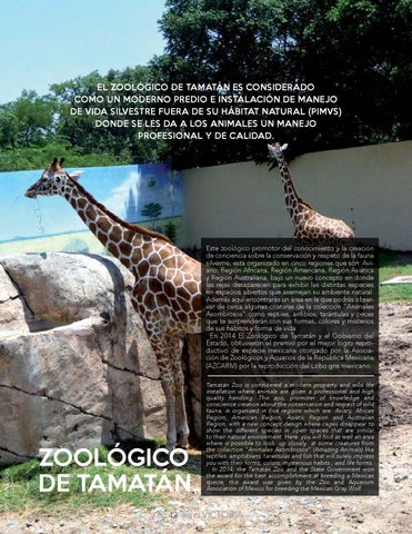 Este zoológico promotor del conocimiento y la creación de conciencia sobre la conservación y respeto de la fauna silvestre, está organizado en cinco regiones que son: Aviario, Región Africana, Región Americana, Región Asiática y Región Australiana, bajo un nuevo concepto en donde las rejas desaparecen para exhibir las distintas especies en espacios abiertos que asemejan su ambiente natural. Además aquí encontrarás un área en la que podrás observar de cerca algunas criaturas de la colección “Animales Asombrosos” como reptiles, anfibios, tarántulas y peces que te sorprenderán con sus formas, colores y misterios de sus hábitos y forma de vida. En 2014 El Zoológico de Tamatán y el Gobierno del Estado, obtuvieron el premio por el mejor logro reproductivo de especie mexicana otorgado por la Asociación de Zoológicos y Acuarios de la República Mexicana (AZCARM) por la reproducción del Lobo gris mexicano.