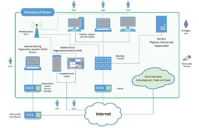 • Home and remote working – all devices used for home and remote working are in scope, whoever owns them, but a user’s self-provided router is not, as the organisation will typically have little control over its configuration.