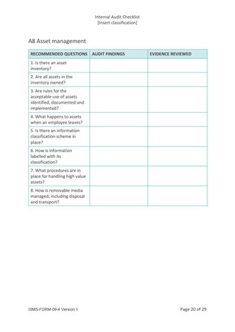 1. Is there an asset inventory? 2. Are all assets in the inventory owned? 3. Are rules for the acceptable use of assets identified, documented and implemented? 4. What happens to assets when an employee leaves? 5. Is there an information classification scheme in place? 6. How is information labelled with its classification? 7. What procedures are in place for handling high value assets? 8. How is removable media managed, including disposal and transport?