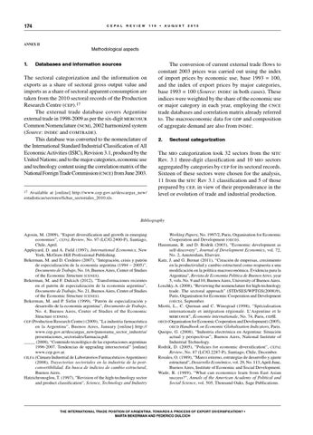 Bibliography Agosin, M. (2009), “Export diversification and growth in emerging economies”, cepal Review, No. 97 (LC/G.2400-P), Santiago, Chile, April. Appleyard, D. and A. Field (1997), International Economics, New York, McGraw-Hill Professional Publishing. Bekerman, M. and D. Cerdeiro (2007), “Integración, crisis y patrón de especialización de la economía argentina (1994 – 2005)”, Documento de Trabajo, No. 16, Buenos Aires, Center of Studies of the Economic Structure (cenes). Bekerman, M. and F. Dulcich (2012), “Transformaciones recientes en el patrón de especialización de la economía argentina”, Documento de Trabajo, No. 21, Buenos Aires, Center of Studies of the Economic Structure (cenes). Bekerman, M. and P. Sirlin (1999), “Patrón de especialización y desarrollo de la economía argentina”, Documento de Trabajo, No. 4, Buenos Aires, Center of Studies of the Economic Structure (cenes). cep (Production Research Centre) (2009), “La industria farmacéutica en la Argentina”, Buenos Aires, January [online] http:// www.cep.gov.ar/descargas_new/panorama_sector_industria/ presentaciones_sectoriales/farmacia.pdf. _____ (2008), “Contenido tecnológico de las exportaciones argentinas 1996-2007. Tendencias de upgrading intersectorial” [online] www.cep.gov.ar. cilfa (Cámara Industrial de Laboratorios Farmacéuticos Argentinos) (2008), Trayectorias sectoriales en la industria de la postconvertibilidad. En busca de indicios de cambio estructural, Buenos Aires. Hatzichronoglou, T. (1997), “Revision of the high-technology sector and product classification”, Science, Technology and Industry