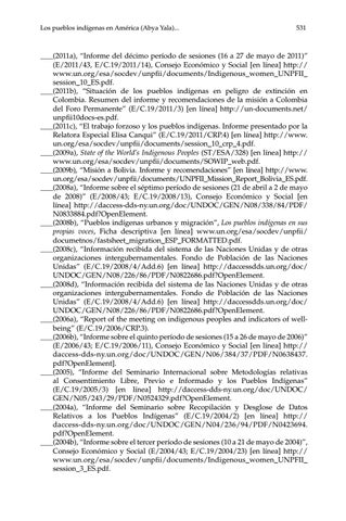 (2011a), “Informe del décimo período de sesiones (16 a 27 de mayo de 2011)” (E/2011/43, E/C.19/2011/14), Consejo Económico y Social [en línea] http:// www.un.org/esa/socdev/unpfii/documents/Indigenous_women_UNPFII_ session_10_ES.pdf. (2011b), “Situación de los pueblos indígenas en peligro de extinción en Colombia. Resumen del informe y recomendaciones de la misión a Colombia del Foro Permanente” (E/C.19/2011/3) [en línea] http://un-documents.net/ unpfii10docs-es.pdf. (2011c), “El trabajo forzoso y los pueblos indígenas. Informe presentado por la Relatora Especial Elisa Canqui” (E/C.19/2011/CRP.4) [en línea] http://www. un.org/esa/socdev/unpfii/documents/session_10_crp_4.pdf. (2009a), State of the World’s Indigenous Peoples (ST/ESA/328) [en línea] http:// www.un.org/esa/socdev/unpfii/documents/SOWIP_web.pdf. (2009b), “Misión a Bolivia. Informe y recomendaciones” [en línea] http://www. un.org/esa/socdev/unpfii/documents/UNPFII_Mission_Report_Bolivia_ES.pdf. (2008a), “Informe sobre el séptimo período de sesiones (21 de abril a 2 de mayo de 2008)” (E/2008/43; E/C.19/2008/13), Consejo Económico y Social [en línea] http://daccess-dds-ny.un.org/doc/UNDOC/GEN/N08/338/84/PDF/ N0833884.pdf?OpenElement. (2008b), “Pueblos indígenas urbanos y migración”, Los pueblos indígenas en sus propias voces, Ficha descriptiva [en línea] www.un.org/esa/socdev/unpfii/ documetnos/fastsheet_migration_ESP_FORMATTED.pdf. (2008c), “Información recibida del sistema de las Naciones Unidas y de otras organizaciones intergubernamentales. Fondo de Población de las Naciones Unidas” (E/C.19/2008/4/Add.6) [en línea] http://daccessdds.un.org/doc/ UNDOC/GEN/N08/226/86/PDF/N0822686.pdf?OpenElement. (2008d), “Información recibida del sistema de las Naciones Unidas y de otras organizaciones intergubernamentales. Fondo de Población de las Naciones Unidas” (E/C.19/2008/4/Add.6) [en línea] http://daccessdds.un.org/doc/ UNDOC/GEN/N08/226/86/PDF/N0822686.pdf?OpenElement. (2006a), “Report of the meeting on indigenous peoples and indicators of wellbeing” (E/C.19/2006/CRP.3). (2006b), “Informe sobre el quinto período de sesiones (15 a 26 de mayo de 2006)” (E/2006/43; E/C.19/2006/11), Consejo Económico y Social [en línea] http:// daccess-dds-ny.un.org/doc/UNDOC/GEN/N06/384/37/PDF/N0638437. pdf?OpenElement]. (2005), “Informe del Seminario Internacional sobre Metodologías relativas al Consentimiento Libre, Previo e Informado y los Pueblos Indígenas” (E/C.19/2005/3) [en línea] http://daccess-dds-ny.un.org/doc/UNDOC/ GEN/N05/243/29/PDF/N0524329.pdf?OpenElement. (2004a), “Informe del Seminario sobre Recopilación y Desglose de Datos Relativos a los Pueblos Indígenas” (E/C.19/2004/2) [en línea] http:// daccess-dds-ny.un.org/doc/UNDOC/GEN/N04/236/94/PDF/N0423694. pdf?OpenElement. (2004b), “Informe sobre el tercer período de sesiones (10 a 21 de mayo de 2004)”, Consejo Económico y Social (E/2004/43; E/C.19/2004/23) [en línea] http:// www.un.org/esa/socdev/unpfii/documents/Indigenous_women_UNPFII_ session_3_ES.pdf.