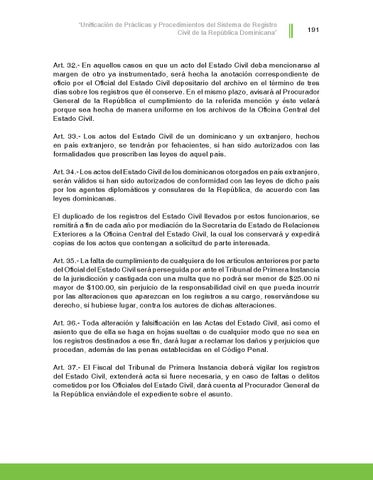 Art. 32.- En aquellos casos en que un acto del Estado Civil deba mencionarse al margen de otro ya instrumentado, será hecha la anotación correspondiente de oficio por el Oficial del Estado Civil depositario del archivo en el término de tres días sobre los registros que él conserve. En el mismo plazo, avisará al Procurador General de la República el cumplimiento de la referida mención y éste velará porque sea hecha de manera uniforme en los archivos de la Oficina Central del Estado Civil. Art. 33.- Los actos del Estado Civil de un dominicano y un extranjero, hechos en país extranjero, se tendrán por fehacientes, si han sido autorizados con las formalidades que prescriben las leyes de aquel país. Art. 34.- Los actos del Estado Civil de los dominicanos otorgados en país extranjero, serán válidos si han sido autorizados de conformidad con las leyes de dicho país por los agentes diplomáticos y consulares de la República, de acuerdo con las leyes dominicanas. El duplicado de los registros del Estado Civil llevados por estos funcionarios, se remitirá a fin de cada año por mediación de la Secretaría de Estado de Relaciones Exteriores a la Oficina Central del Estado Civil, la cual los conservará y expedirá copias de los actos que contengan a solicitud de parte interesada. Art. 35.- La falta de cumplimiento de cualquiera de los artículos anteriores por parte del Oficial del Estado Civil será perseguida por ante el Tribunal de Primera Instancia de la jurisdicción y castigada con una multa que no podrá ser menor de $25.00 ni mayor de $100.00, sin perjuicio de la responsabilidad civil en que pueda incurrir por las alteraciones que aparezcan en los registros a su cargo, reservándose su derecho, si hubiese lugar, contra los autores de dichas alteraciones. Art. 36.- Toda alteración y falsificación en las Actas del Estado Civil, así como el asiento que de ella se haga en hojas sueltas o de cualquier modo que no sea en los registros destinados a ese fin, dará lugar a reclamar los daños y perjuicios que procedan, además de las penas establecidas en el Código Penal. Art. 37.- El Fiscal del Tribunal de Primera Instancia deberá vigilar los registros del Estado Civil, extenderá acta si fuere necesaria, y en caso de faltas o delitos cometidos por los Oficiales del Estado Civil, dará cuenta al Procurador General de la República enviándole el expediente sobre el asunto.