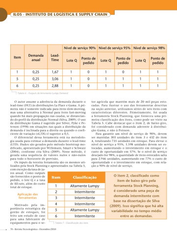 tor agrícola que mantém mais de 20 mil peças estoO autor assume a aderência da demanda durante o cadas. Para ilustrar o uso das ferramentas descritas lead-time (DLT) às distribuições La Place e Gama. A prina seção anterior, utilizamos séries de seis itens com meira não é somente indicada para itens slow-moving, características diferentes. Primeiramente, foi usada mas uma alternativa à Normal para itens fast-moving a ferramenta Stock Planning, que forneceu uma priquando há mais propagação nas caudas, se distancianmeira classificação dos itens, como pode ser visto na do do perfil da distribuição Normal (Silva, 2009). O uso Tabela 5. Cabe destacar que o item 2, de baixo giro, da distribuição Gama é sugerido por Silver, Pyke e Pefoi considerado com demanda aderente à distribuiterson (1998) em situações nas quais a distribuição da ção Gama, e não à Poisson. demanda é inclinada para a direita ou quando o coefiPara garantir um nível de serviço de 90%, devem ciente de variação (ıL/DL) é superior a 0,5. ser mantidas 303 unidades do item 3 e 432 do item O diferencial dessa ferramenta está na metodolo4, totalizando 735 unidades em estoque. Para elevar o gia usada para estimar a demanda durante o lead-time nível de serviço a 95%, 1.598 unidades devem ser es(LTD). Dados são gerados pelo método bootstrap motocadas, aumentando o investimento em estoque e o dificado, apresentado por Willemain, Smart e Schwarz custo de oportunidade em 57%. Se o nível de serviço (2004), conforme cita Silva (2009). Nesse método, é desejado for 98%, a quantidade de itens estocados salta gerada uma sequência de valores nulos e não-nulos para 2.946 unidades, aumentando em 77% o custo de para todo o horizonte de previsão. oportunidade e o investimento em estoque, com relaOs inputs da terceira ferramenta são os mesmos utição a 90% de nível de serviço. lizados pela Stock Planning e apresentados na Tabela 5, com exceção da taxa de juros anual. Como outputs O item 2, classificado como são fornecidos o ponto de Item Classificação pedido, o lote Q e a taxa item de baixo giro pela de fill-rate, além do custo ferramenta Stock Planning, 1 Altamente Lumpy total de estoque.
