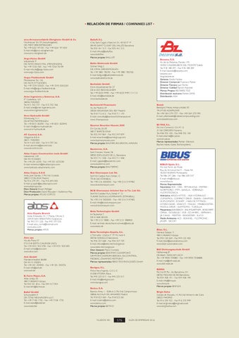 BIBUS Spain, S.L. Pol. Ind. Porto do Molle Rua do Arroncal, Vial C – Nave 4A 36350 NIGRAN Pontevedra Tel 986 247 286 - Fax 986 209 247 E-mail: info@bibus.es www.bibus.es Marcas Representadas Neumática: ACE - CKD - FIM VALVOLE - MATRIX NORMYDRO - PTM - SANG-A - VORWALD VUOTOTECNICA Hidráulica: ARGO-HYTOS - ASA HYDRAULIC COMATROL- COMPACT DRIVE - DAIKIN - DANFOSS - DUPLOMATIC- ECKART - HAELOK FITTINGS HYDRO-GEAR - KRACHT - MAHLE - MINIBOOSTER - MODUL DRIVE - SUMITOMO - TUROLLA Mecatrónica: BANSBACH - BAUMGARTNER - BOSCHERT CERSA - DOUBLE-JU - EGE - EZ-WHEEL - GERWAH - JIE CANG - MEISTER - RINGFEDER - SUCO Medio Ambiente: ACS - BONNEL - FLOTRONIC JÄGER - SECOH Bilan, S.L. General Salazar, 11 48012 BILBAO Vizcaya Tel. 944 100 064 - Fax 944 102 400 E-mail: bilan@automatismos.com www.bilan-automation.com Billi Dichtungstechnik GmbH Nelkenweg 8ª DE-86641 RAIN AM LECH Tel. +49 9090 705880 - Fax +49 9090 7058888 E-mail: mail@billi-seals.de www.billi-seals.de BINSA Pol. Ind. El Pla - Av. Barcelona, 231 08750 MOLINS DE REI Barcelona Tel. 934 458 191 - Fax 934 458 199 E-mail: info@binsa.es www.binsa.es Marcas propias: BINFLEX Birgin Selva Colada de Pozuelo, 14. Pol. Ind. Ventorro del Cano 28925 MADRID Tel. 916 330 422 - Fax 916 333 949 E-mail: birginselva@birginselva.net www.birginselva.com