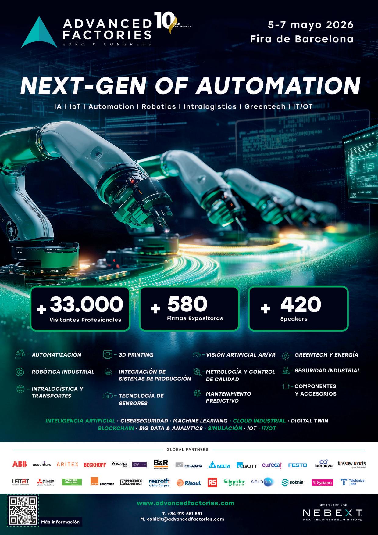 Del 5 al 7 de mayo en Barcelona, Advanced Factories 2026 reunirá a más de 33.000 profesionales industriales que buscan incorporar nuevas tecnologías de automatización en sus plantas de producción. Se trata de una magnífica oportunidad para ofrecer soluciones ante potenciales clientes que acuden en busca de su próximo partner tecnológico e industrial e impulsar las ventas.
