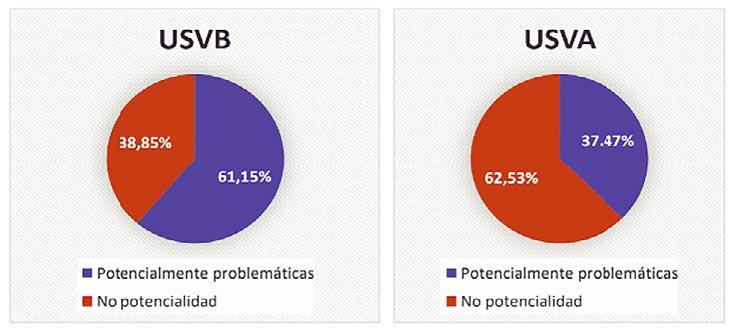 Analizando de forma pormenorizada las situaciones que sí podrían conllevar problemática, en 2015 de los casos filiados por USVB, 38 fueron por agresiones (AG), 174 por intoxicaciones producidas por el consumo de alcohol y/o estupefacientes (IN) y 15 por pacientes con alteración psiquiátrica (PS). De los reportados por USVA, 3 (AG) 11 (IN) y 14 (PS). En 2016, 42 (AG), 199 (IN) y 12 (PS) por USVB; 6 (AG) 10 (IN) y 7 (PS) por USVA. En 2017, 47 (AG), 210 (IN) y 15 (PS) por USVB; 4 (AG) 8 (IN) y 22 (PS) por USVA. En 2018, 47 (AG), 290 (IN) y 12 (PS) por USVB; 6 (AG) 14 (IN) y 11 (PS) por USVA. En 2019, 55 (AG), 329 (IN) y 10 (PS) por USVB; 7 (AG) 20 (IN) y 24 (PS) por USVA.