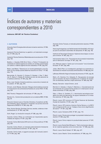 Índices de autores y materias correspondientes a 2010 (números 380-387 de Técnica Cerámica)