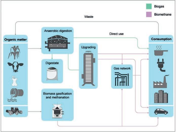 El biogás es una mezcla de metano (CH4), CO2 y pequeñas cantidades de otros gases, en proporciones variables, que se genera durante la digestión anaerobia de la materia orgánica, es decir, durante la descomposición biológica de la materia en un entorno sin oxígeno. Se obtiene, fundamentalmente, de los residuos ganaderos y agroindustriales, de los lodos de estaciones depuradoras de aguas residuales urbanas (EDAR) y de la fracción orgánica de los residuos sólidos urbanos (RSU). Su composición exacta depende de la naturaleza de la materia orgánica a partir de la que se obtiene y de la vía de producción. Así, el contenido en metano suele oscilar entre el 45 y el 75% en volumen, siendo la mayor parte del resto CO2, por lo que su contenido energético también varía, concretamente los valores del poder calorífico inferior (PCI o en inglés LHV, de Lower Heating Value) están entre 16 y 28 MJ/m3. En cuanto a la producción, tiene lugar en (a) biodigestores, que son tanques herméticos en los que la materia orgánica diluida en agua es descompuesta por microorganismos; (b) sistemas de recuperación de gas de vertederos, que capturan el biogás generado por los residuos mediante sistemas de tuberías, pozos de extracción y compresores; y (c) EDAR equipadas con sistemas de recuperación de materia orgánica y nutrientes (nitrógeno y fósforo) presentes en los lodos, cuyo tratamiento posterior en tanques biodigestores permite obtener biogás.