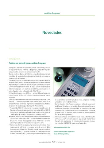el usuario tales como longitud de onda, rango de medida, unidades y número de decimales. • Concentración. Esta función puede ser utilizada para medir de 2 hasta 14 patrones conocidos. Dependiendo de los pares concentración/absorción obtenidos, el fotómetro calculará una interpolación lineal entre los puntos medidos. Es posible guardar hasta 10 métodos para utilizarlos en posteriores análisis de muestras problema. • Algunas ventajas: selección longitud onda automática; fácil manejo; software en español; capacidad memoria de hasta 1.000 resultados; 10 métodos definibles por el usuario; interfaz RS232/USB; waterproof y portátil. www.serviquimia.com (Véase anuncio en la sección Guía del Comprador.)