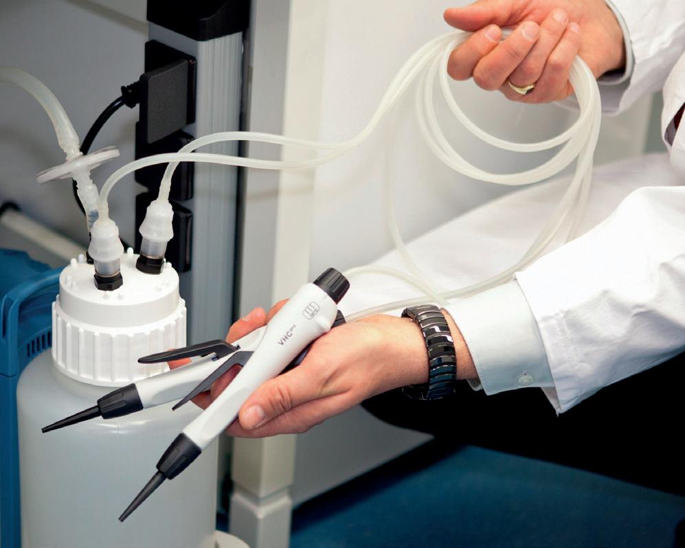 El instrumento gira 360° para un posicionamiento adecuado en la botella, lo que hace que el volumen sea claramente visible desde cualquier posición. Su ajuste de volumen con una sola mano, su agarre ergonómico y su suave funcionamiento contribuyen a reducir la fatiga del usuario.