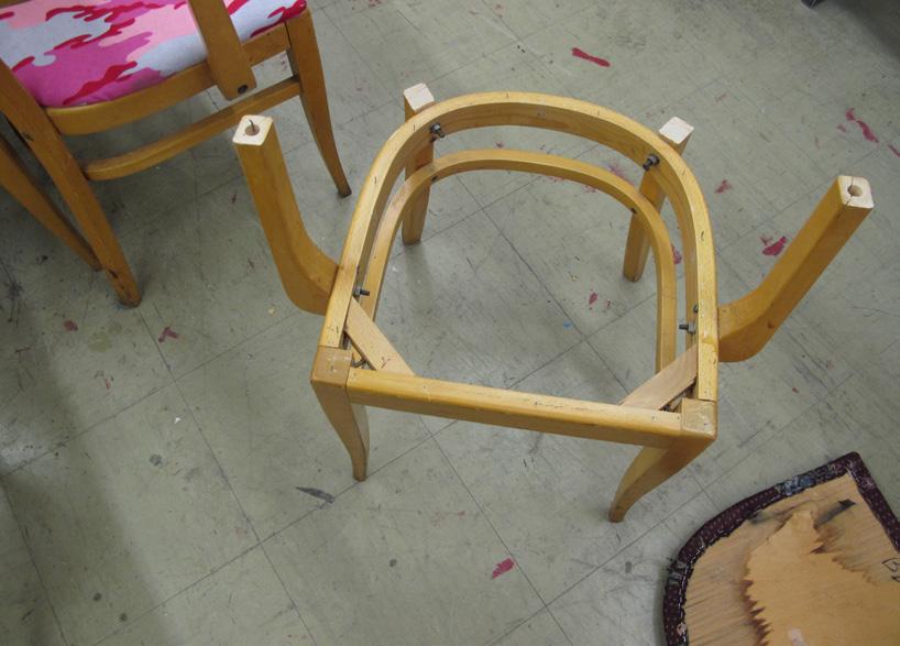 La personnalisation est légion et seule maître à bord : une soixantaine de chaises de bois oubliées dans l’entrepôt tombent entre les mains d’élèves déterminés dans la création. Tissu floral hawaïen ou drapé brésilien, duvet synthétique de lapin ou vinyle anthracite étoilé : les pos sibilités et variations de recouvrement sont mathémati quement riches. « Est-ce qu’on peut faire une chaise? » est tacitement adopté comme un code d’entrée sur les lieux. Deux groupes d’élèves se dédient à une production inten sive : ici on sort la chaise de ses gonds, on la décloute, on lui découpe un mohawk, ou lui greffe une perruque sur l’avant-bras, le bruit des agrafeuses retentit, tac-tac-tac. La Fabrique ne produit que des modèles uniques : chacun personnalise sa chaise, y introduit ses différences, c’est un modus operandi où le duplicata n’existe pas. On s’amuse à imaginer le patchwork des dernières élues qui s’arrache ront les ultimes résidus de tissu. Le rituel se répète jusqu’à l’écoulement des stocks…