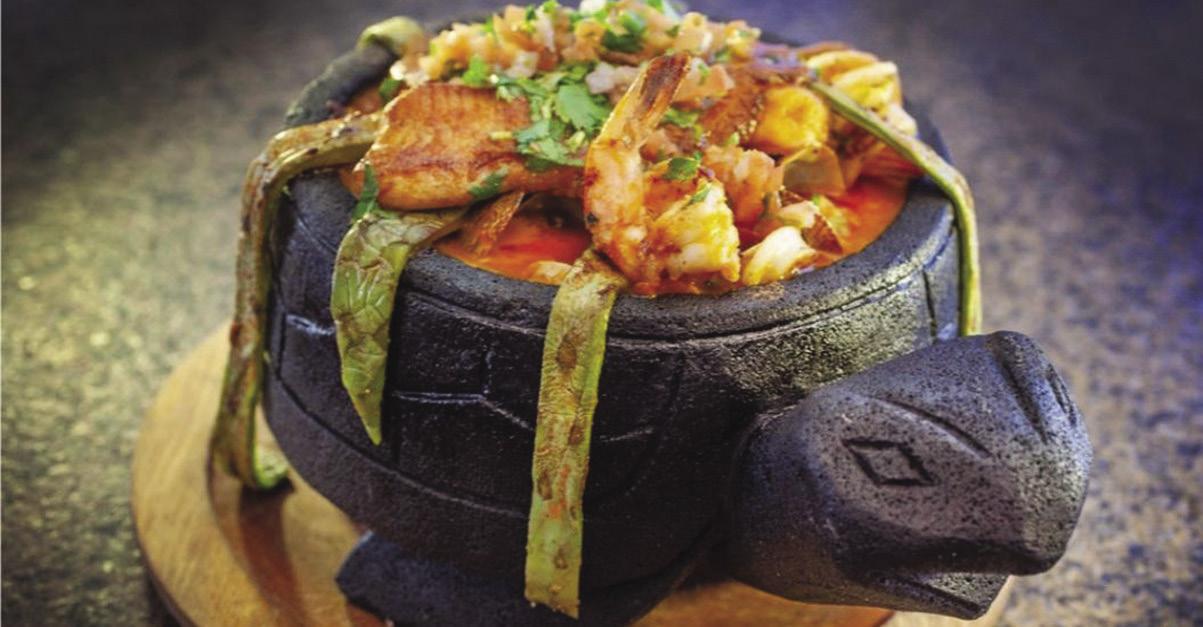 scallops, octopus, shrimp, tilapia, calamari, clams, and cactus with chorizo and cheese in volcanic rock bowl