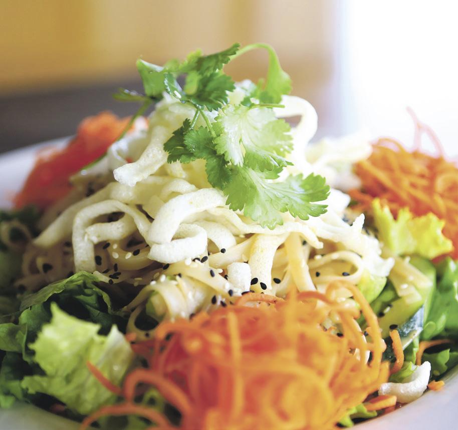 rice noodles, greens, cucumbers, chicken, sesame seeds, carrots, peanut sauce