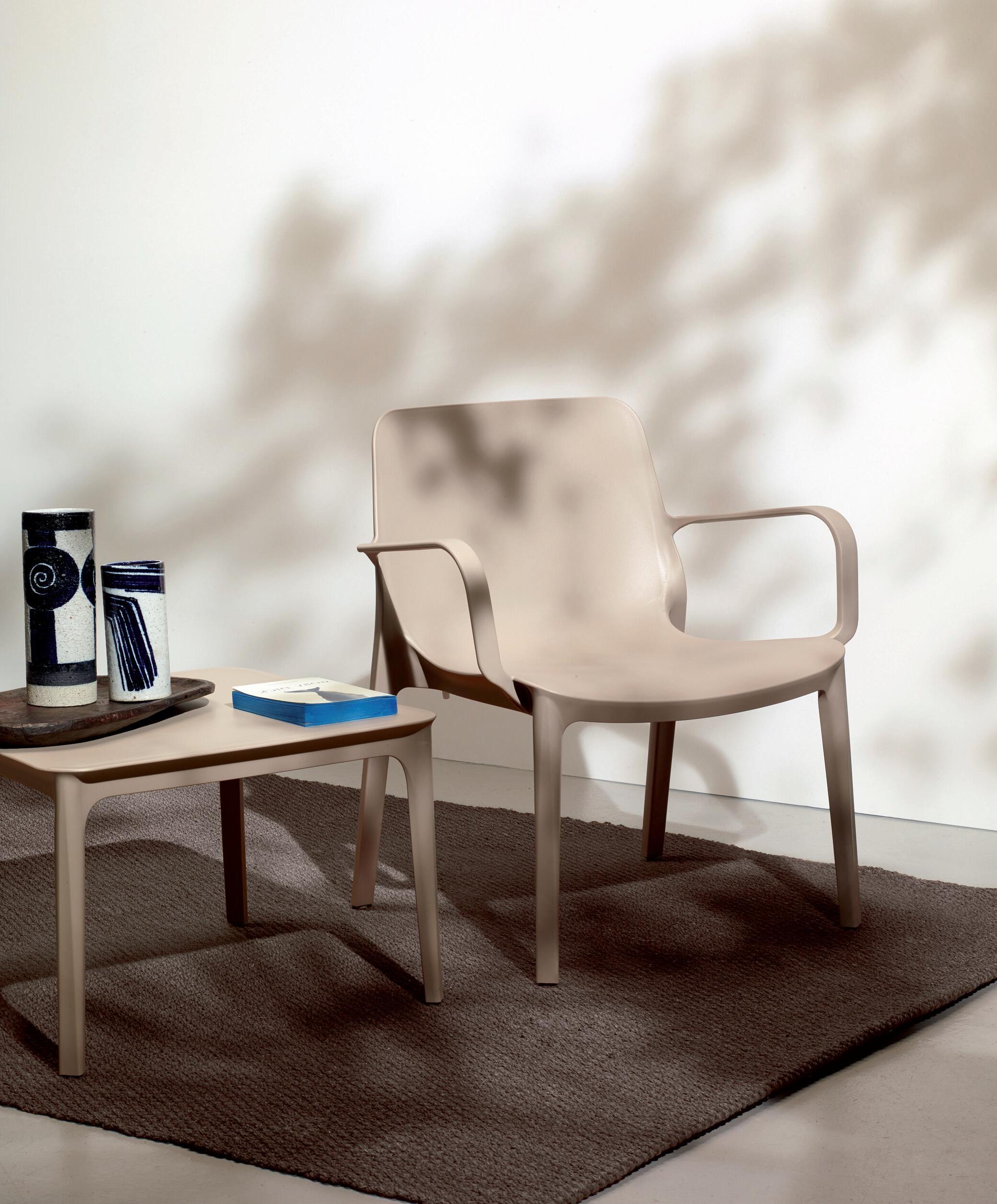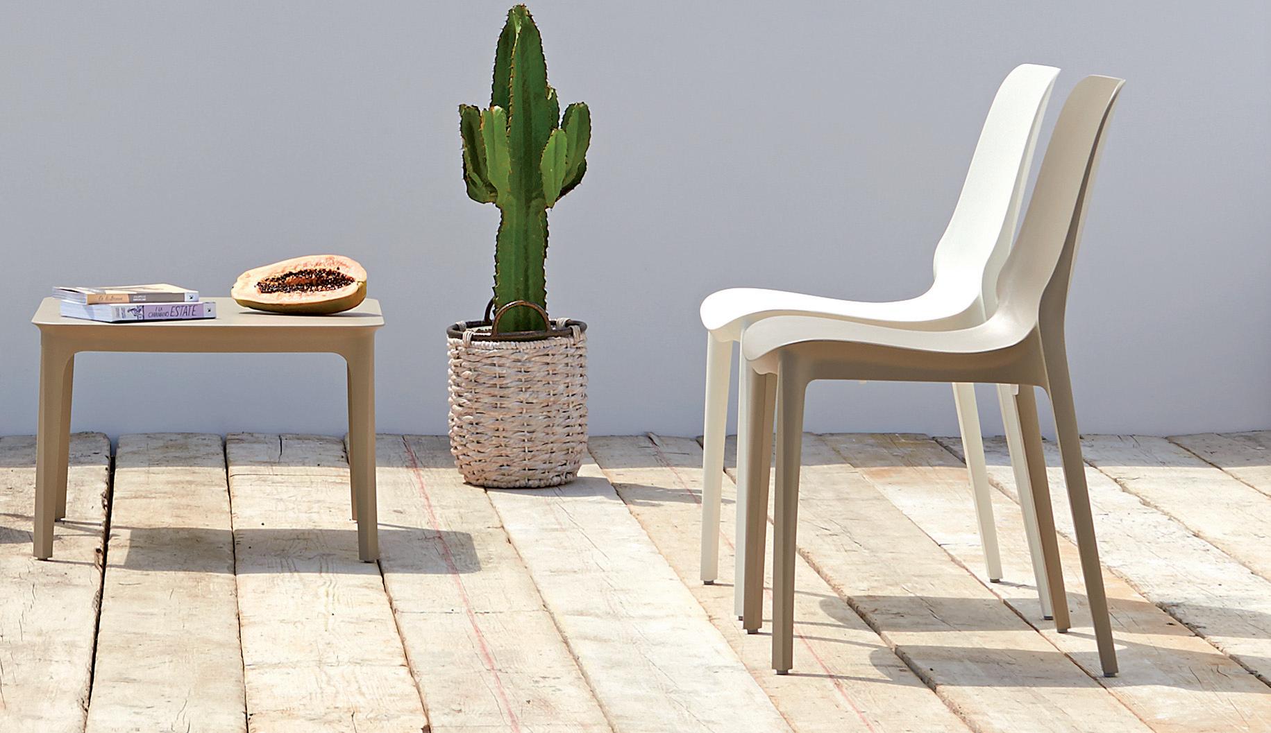 The technopolymer frame means it can be used both in public meeting places and in the garden at home. The Ginevra collection is completed by the Lounge version with a wider seat.