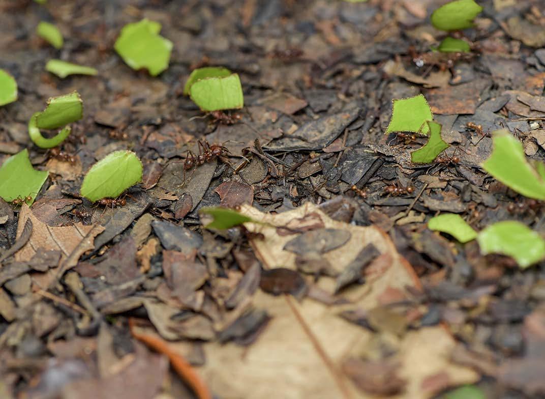 A pesar de que no se parecen a los zompopos de mayo, las hormigas cortadoras de hojas en esta fotografía pertenecen a la casta obrera y son de la misma especie, Atta cephalotes Tapón Creek, Livingston; marzo 12 de 2020. / David Arrivillaga.