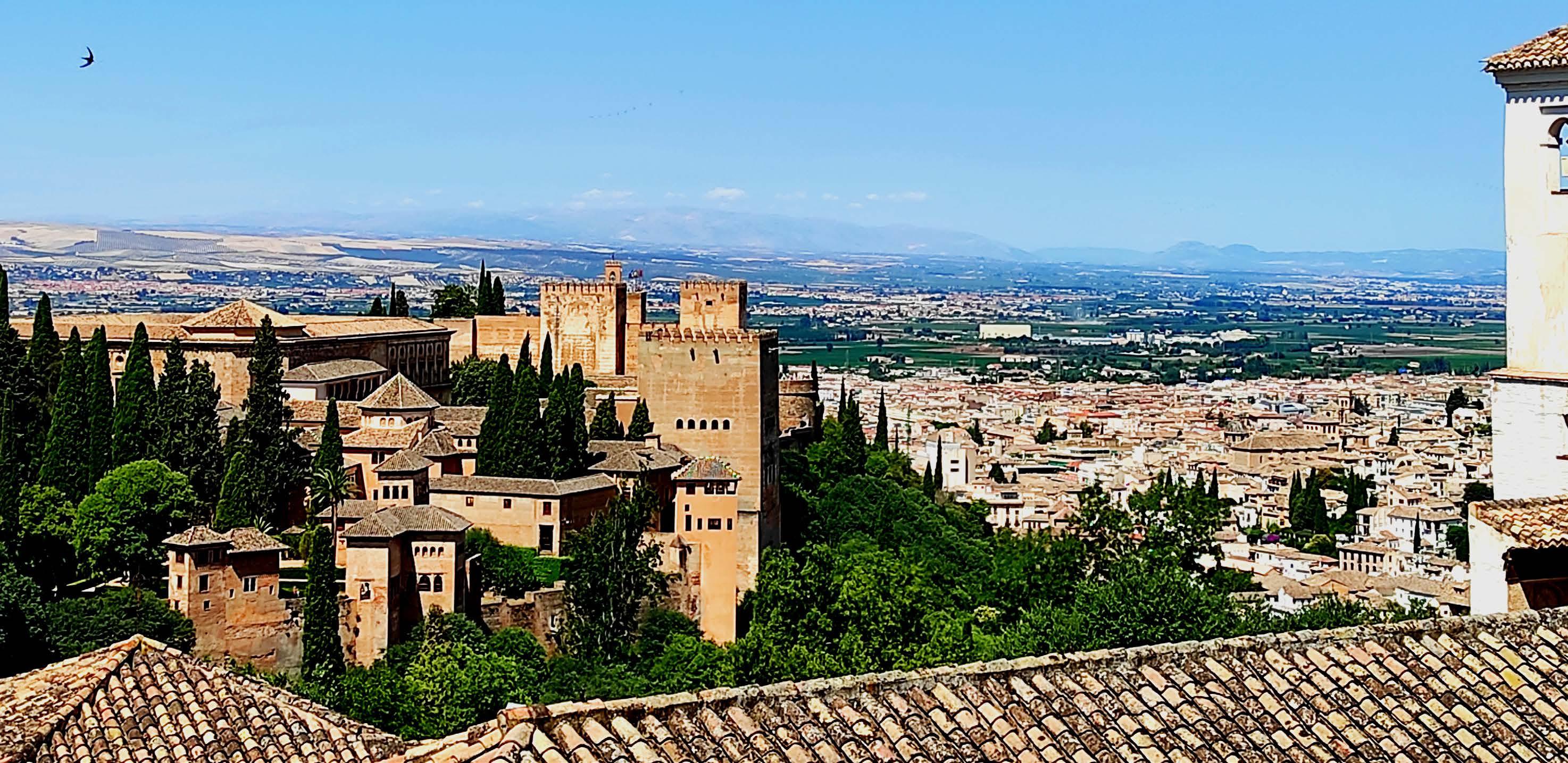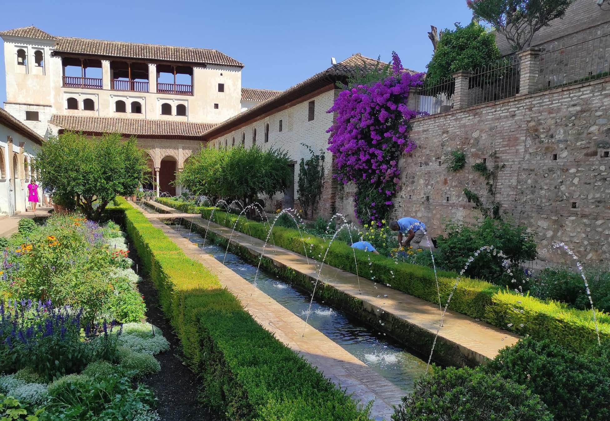 Y al fondo, en lo alto de otra cima: El Generalife y sus jardines. Se trata del lugar de retiro y descanso de los reyes nazaríes. Ricamente ajardinado, con flores, plantas, huertas y fuentes, en este recinto el agua es un elemento fundamental. Se distingue bien por estar encalado en blanco que aporta más frescor y por poseer tranquilos paseos, miradores y patios como el del Ciprés de la Sultana, la Escalera del Agua, el Mirador Romántico, el de Ismail I o el Patio de la Acequia.