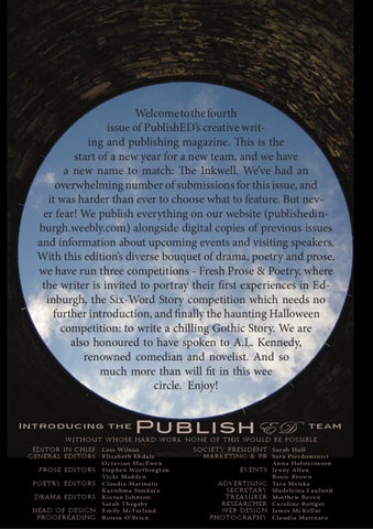 Welcome to the fourth issue of PublishED’s creative writing and publishing magazine. This is the start of a new year for a new team, and we have a new name to match: The Inkwell. We’ve had an overwhelming number of submissions for this issue, and it was harder than ever to choose what to feature. But never fear! We publish everything on our website (publishedinburgh.weebly.com) alongside digital copies of previous issues and information about upcoming events and visiting speakers. With this edition’s diverse bouquet of drama, poetry and prose, we have run three competitions - Fresh Prose & Poetry, where the writer is invited to portray their first experiences in Edinburgh, the Six-Word Story competition which needs no further introduction, and finally the haunting Halloween competition: to write a chilling Gothic Story. We are also honoured to have spoken to A.L. Kennedy, renowned comedian and novelist. And so much more than will fit in this wee circle. Enjoy! Introducing the