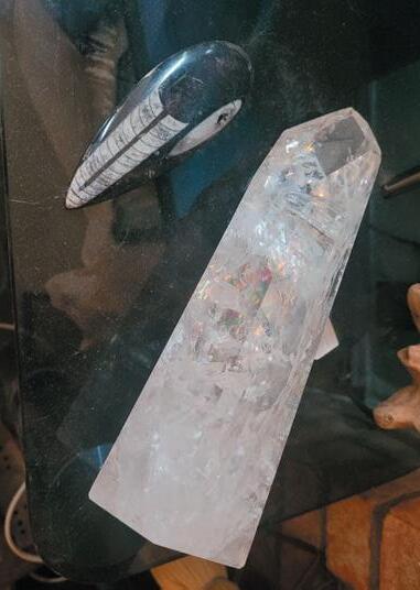 There was a rare Elestial Topaz, which is protective and guards against the negative, and across the room sits a beautiful stone formed with clusters of cream-colored Albite with Lepidolite, which helps to ease depression, fatigue, and stress.